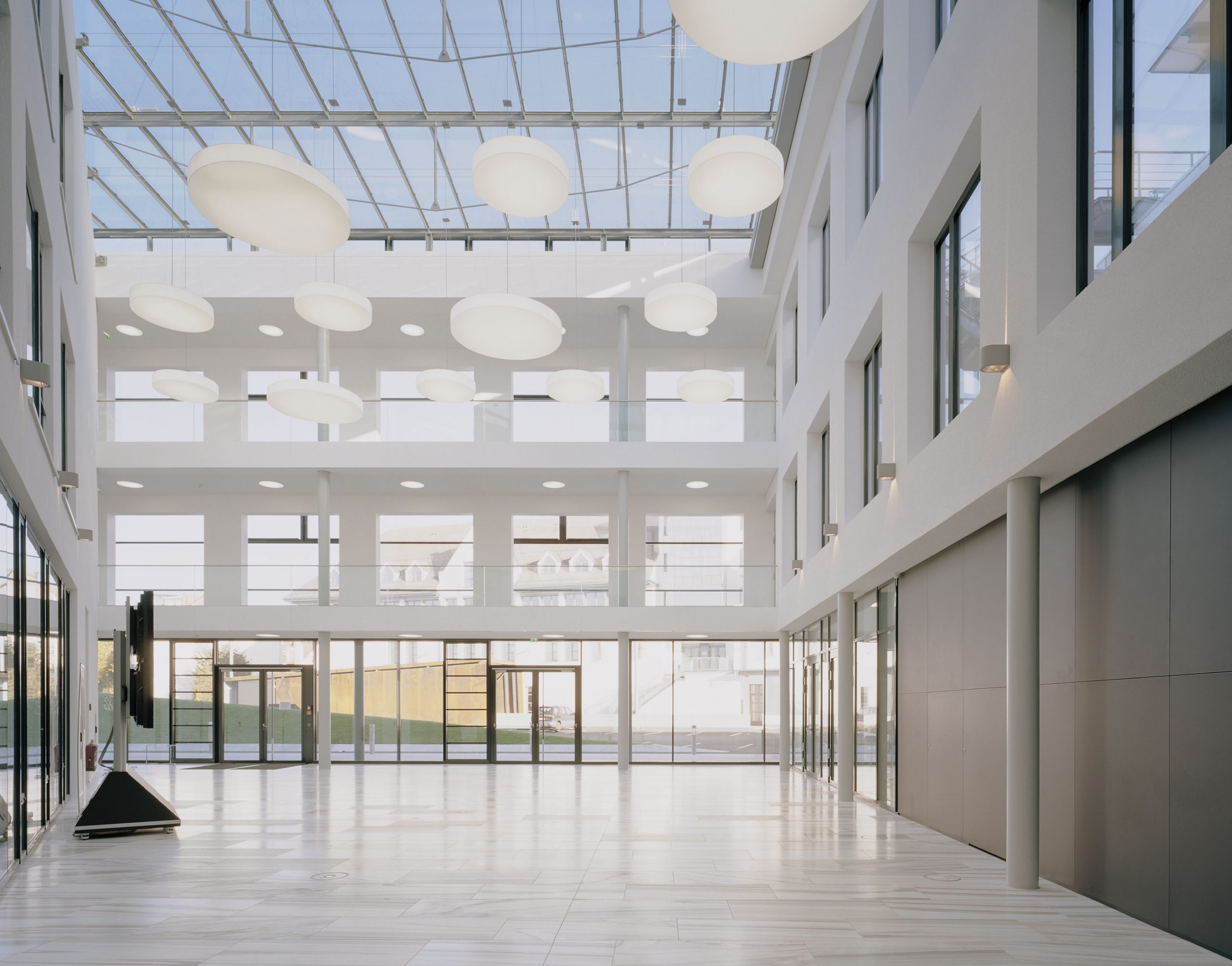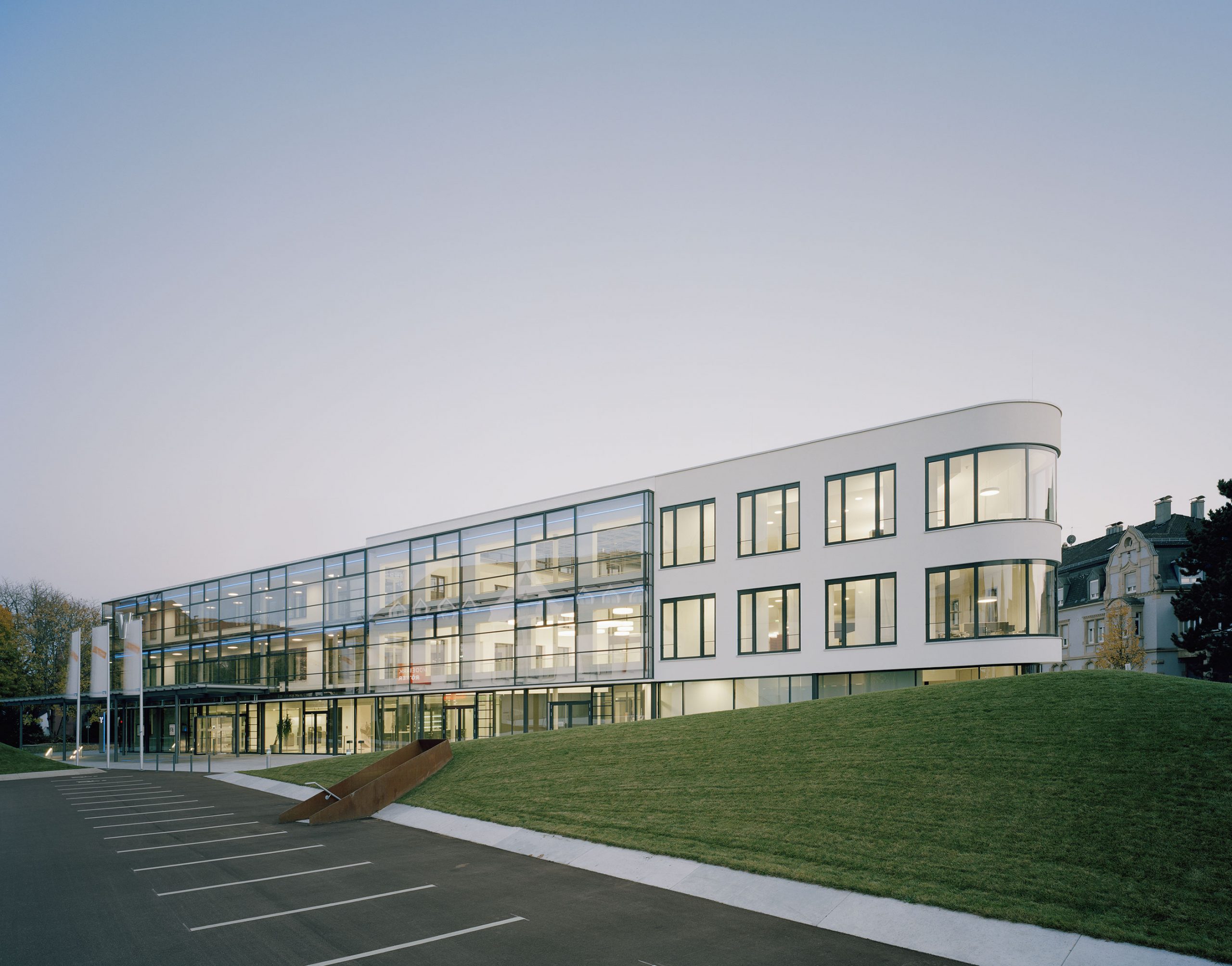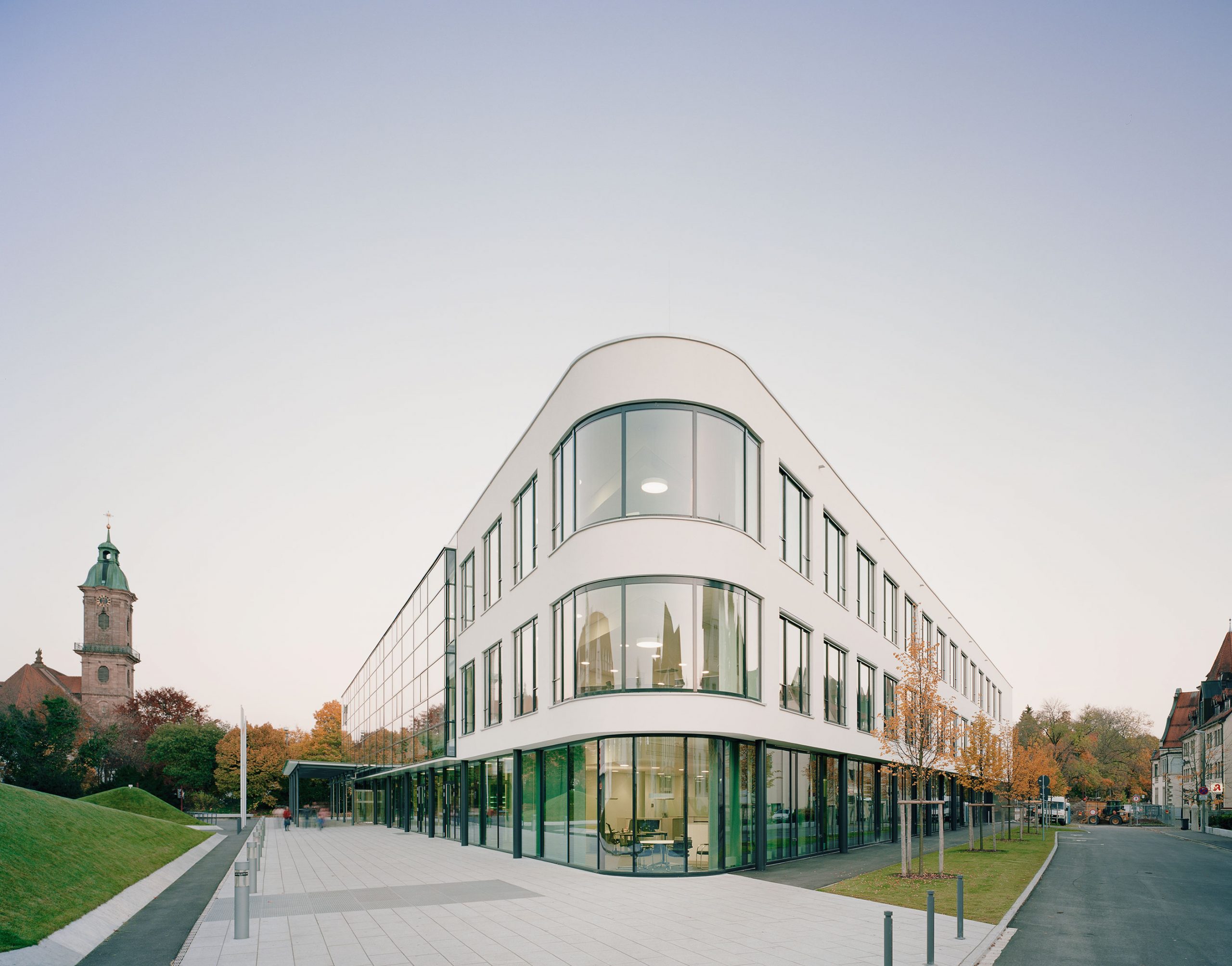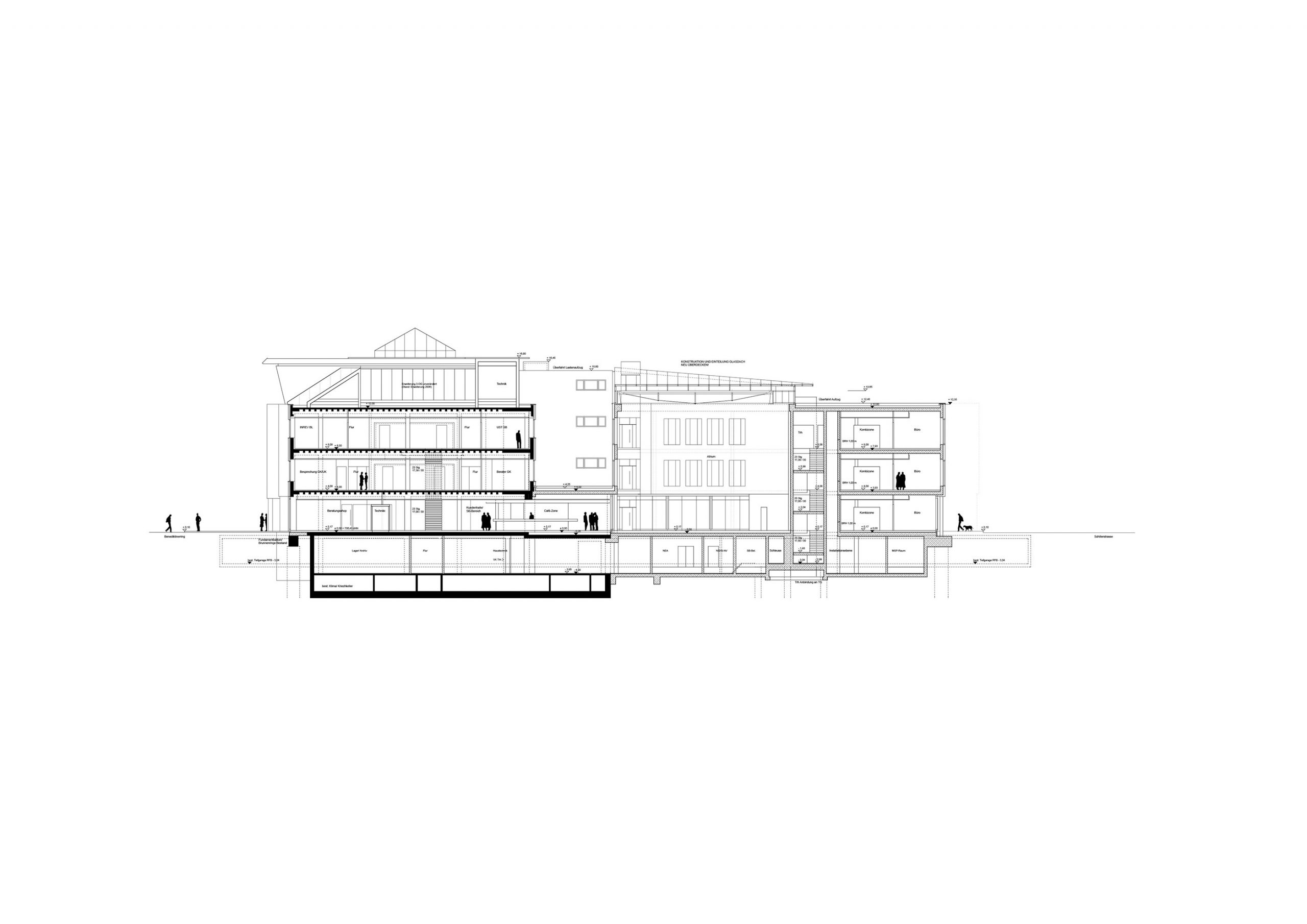 Das bauliche Konzept der Erweiterung definiert eine den westlichen Grundstücksbereich aufnehmende Form. Diese dockt an das bestehende aussenliegende Treppenhaus des Bestandes an. Es entsteht somit ein Miteinander von bestehendem und neu definiertem baulichen Gepräge. Durch die Übernahme der Traufkante des Bestands wird ein Miteinander der Baukörper bewirkt, welches der kleinmasstäblichen Situation der Schillerstrasse gerecht wird. Durch die Zuwendung des Haupteingangs zur Parkierungsfläche wird die städtebauliche Bedeutung dieses Raumes signifikant; diese wird entscheidend durch das verbindende Erschliessungselement des Bestands- und Neubaus in der Massstäblichkeit des durchlaufenden Fassadenbildes als Pendant zum bestehenden Marktkauf-Gebäude noch verstärkt.