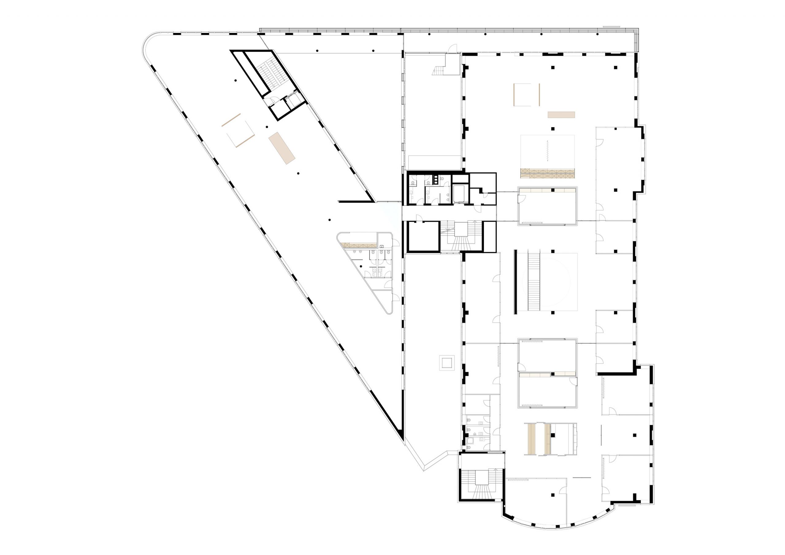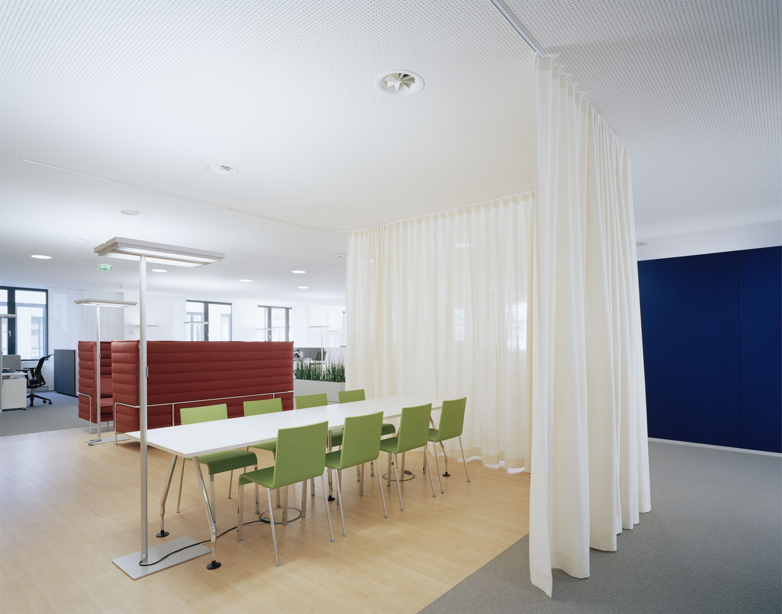 Die Fassadenstruktur des Neubaus, beginnend in der Schillerstrasse, wickelt sich wie ein „Band“ um die konstruktiven Fassadenelemente des Neubaus und der Eingangsfassade des Altbaus und lassen durch die transparente Ausbildung der zweiten Schale die beiden Baukörper als Einheit erscheinen. Dieses „Fassadenspiel der Umhüllung“ wäre im Rahmen einer vorstellbaren Kostensituation zugunsten einer Gesamt-Lösung als Einheit auch erweiternd bis zur Vertikalen des „Vorstands-Erkers“ in der Benediktinerring-Fassade denkbar! Der Erweiterungsbau erhält eine Innenhofstruktur, die als Eventfläche und erweiterbares Cafe nutzbar ist und sich über die vorgelagerte Fassade mit ihren öffenbaren Elementen in die Aussenfläche verlagert und diese somit belebt.