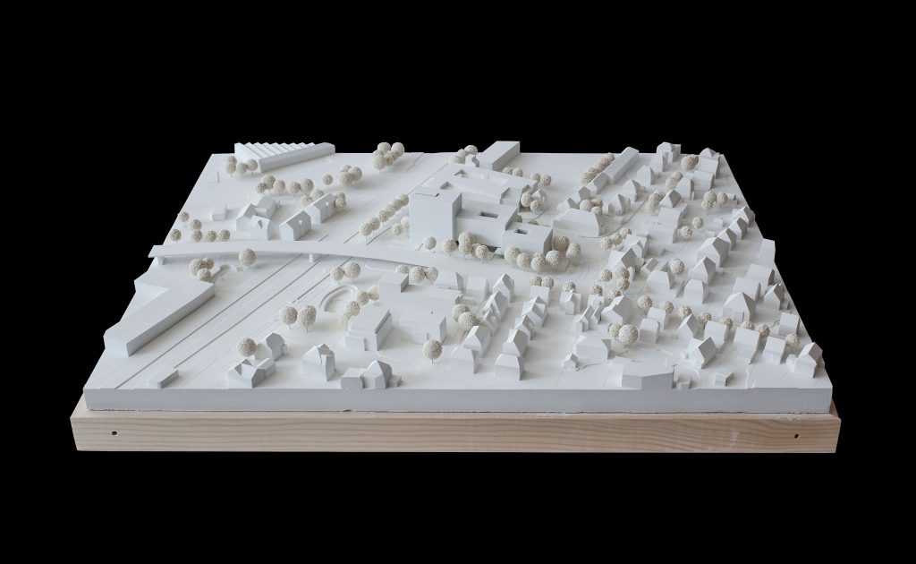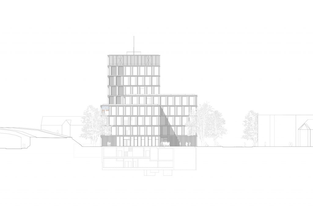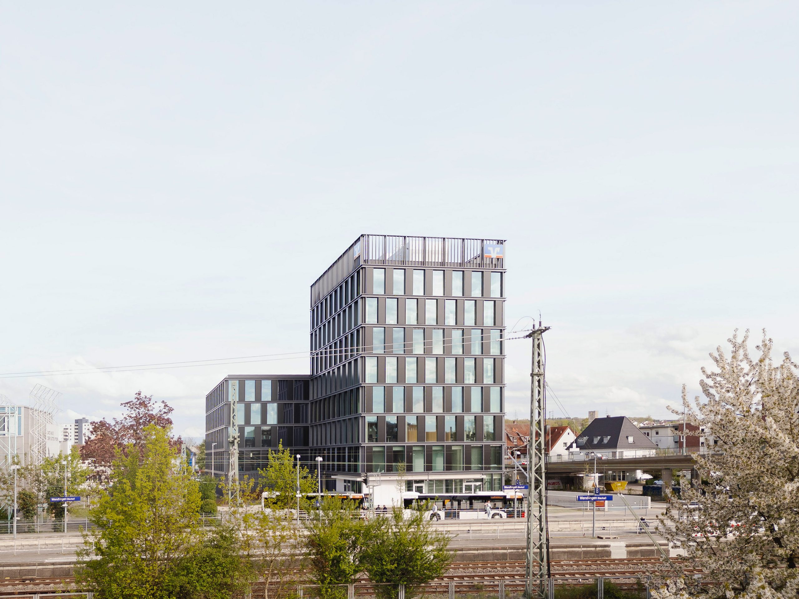 Das Projekt nutzt die exponierte Lage zwischen Bahnhofstraße und Stuttgarter Straße nicht nur pragmatisch, sondern symbolisch. Der Neubau positioniert sich als städtebauliche Setzung am Eingang der Stadt – als markantes Bauwerk, das Orientierung bietet und gleichzeitig Vermittler ist: zwischen dem infrastrukturellen Kontext der Brücke, der heterogenen Nachbarschaft und der künftigen Entwicklung des Bahnhofsquartiers. Die Höhenentwicklung des Baukörpers reagiert auf die topographischen Gegebenheiten des Grundstücks, das sich von Westen nach Osten leicht ansteigend präsentiert. Durch die bewusste Staffelung der Baukörper entsteht eine kraftvolle Silhouette, die das Stadtbild prägt und rhythmisiert.