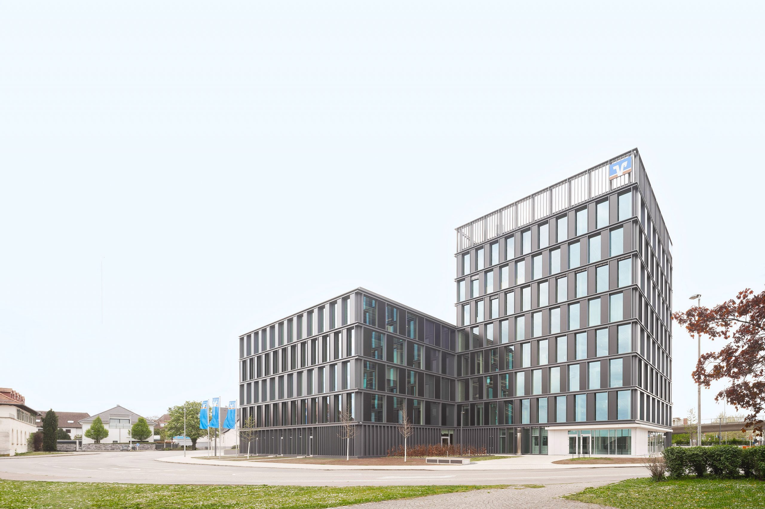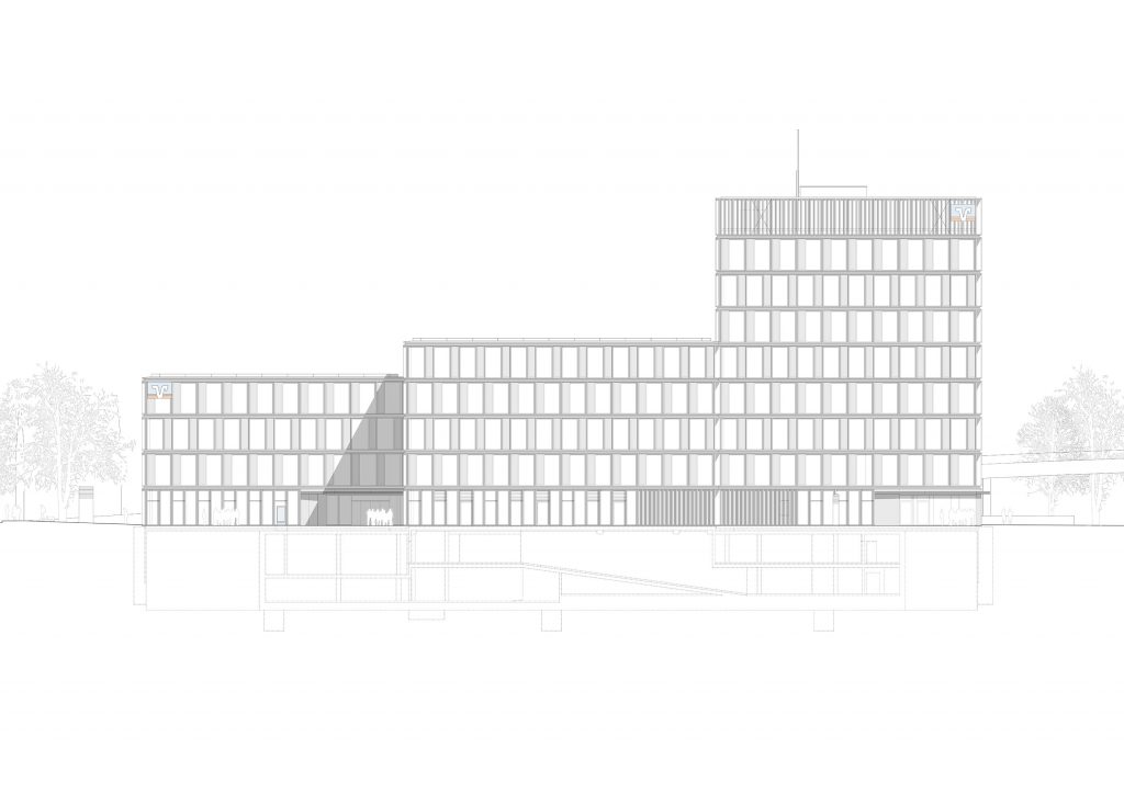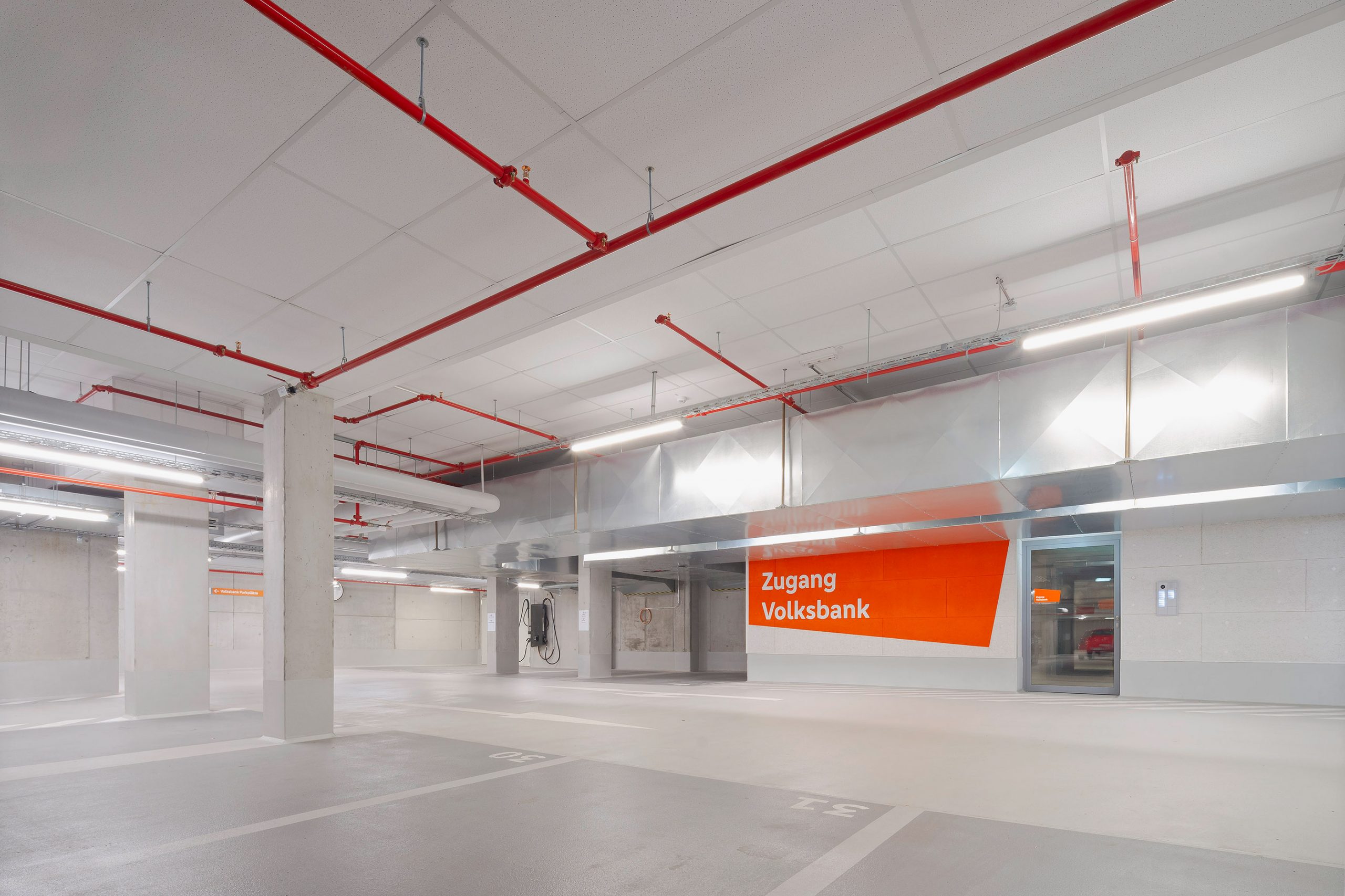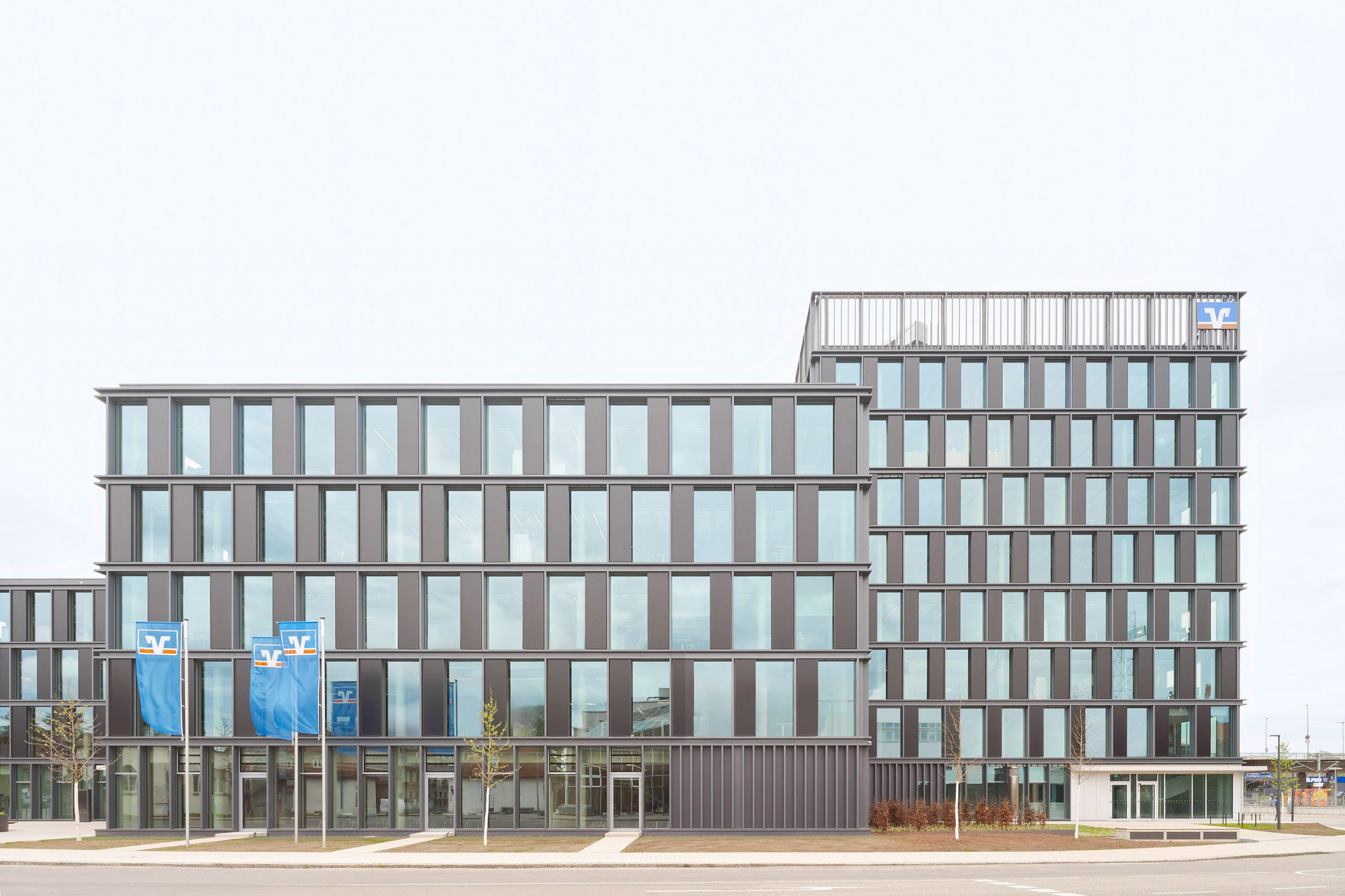 Der Neubau versteht sich als moderne Arbeitswelt mit menschlichem Maß. Großzügige Bürostrukturen, offene Grundrisskonzepte und natürlich belichtete Innenhöfe erzeugen eine Atmosphäre, die auf Austausch, Konzentration und Wohlbefinden gleichermaßen zielt. Die Raumtiefen variieren zwischen 7,80 m und 21,00 m und lassen eine Vielzahl an Büroformen zu – von Einzelbüros bis zu Open-Space-Strukturen. Die Raumplanung wurde gemeinsam mit der Volksbank in mehreren Workshops abgestimmt und in einem präzise gegliederten Flächenkonzept verankert. Nicht nur innen, auch außen steht Offenheit im Fokus: Die Architektur öffnet sich zur Stadt. Drei skulptural gestaffelte Baukörper – vom viergeschossigen Volumen bis zum achtgeschossigen Hochpunkt mit Technikgeschoss – strukturieren das Ensemble. Ein zentraler Eingangsplatz im Nordosten bildet die kommunikative Mitte, von der aus Volksbank, Konferenzbereiche und Cafeteria erschlossen werden. Im Westen öffnet sich das Gebäude zur Stadt mit einem markanten Hochpunkt und einem separaten Eingang für Polizei und Fremdnutzung.