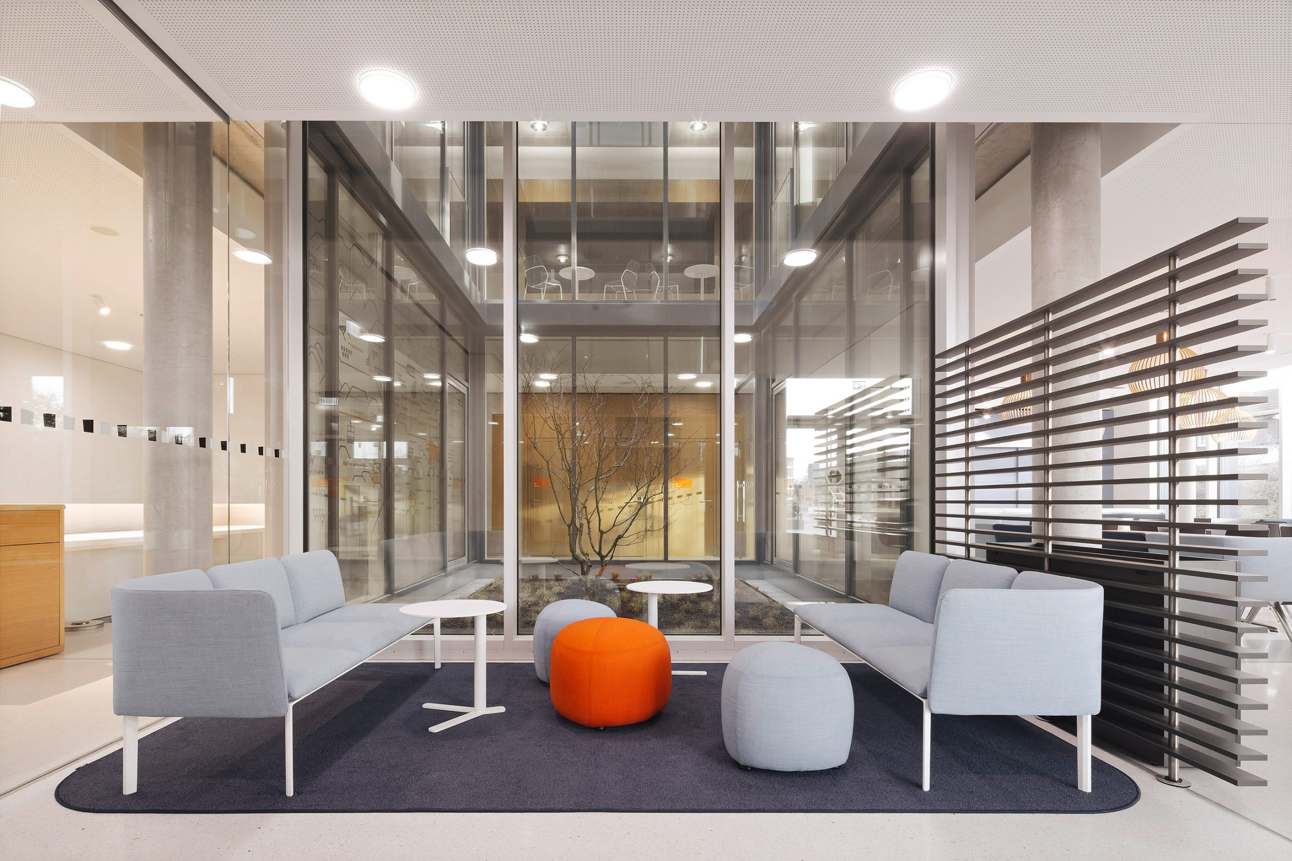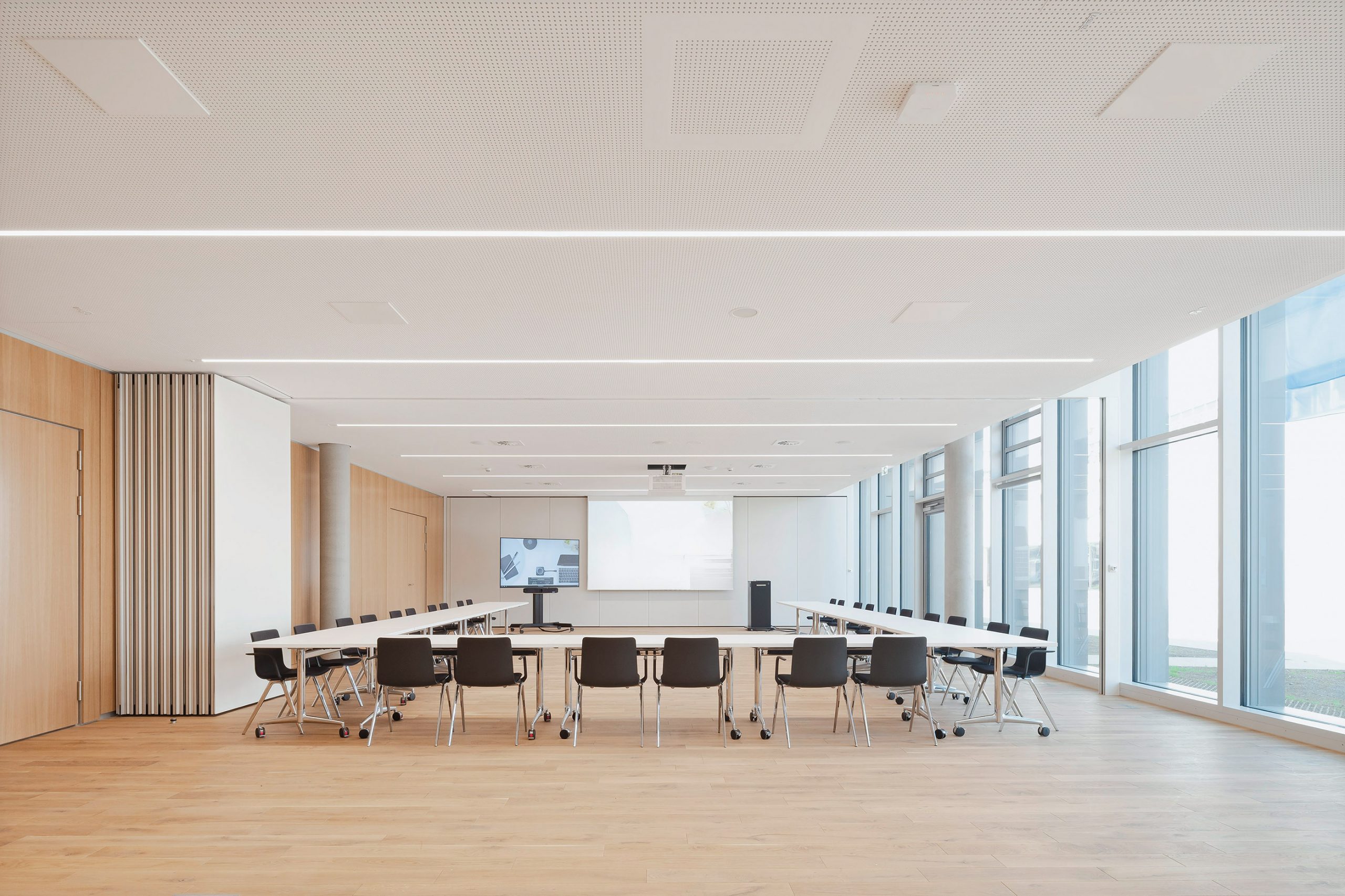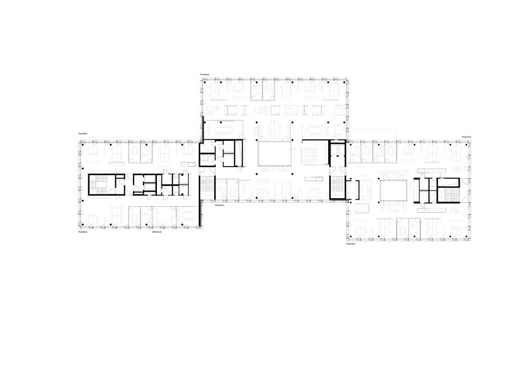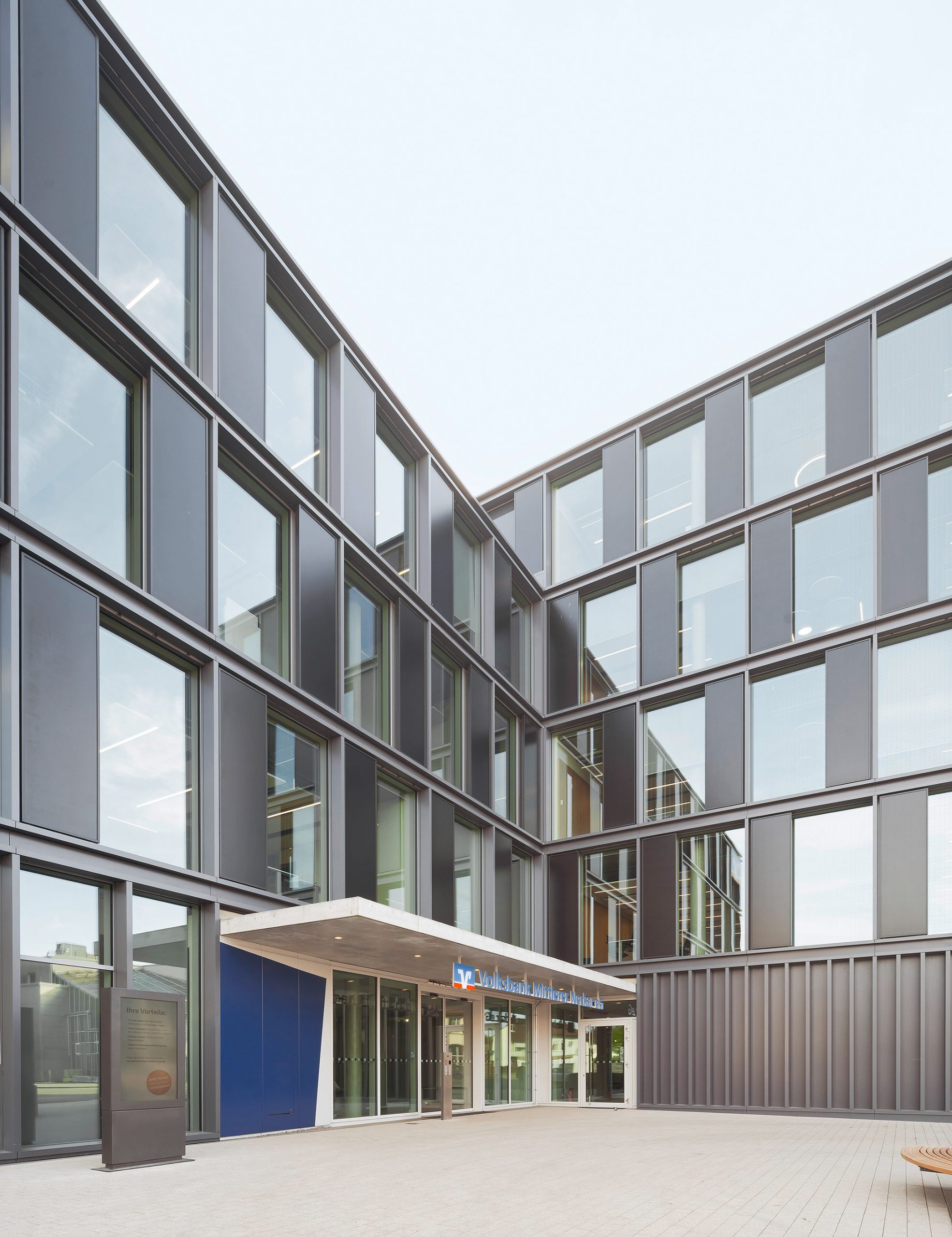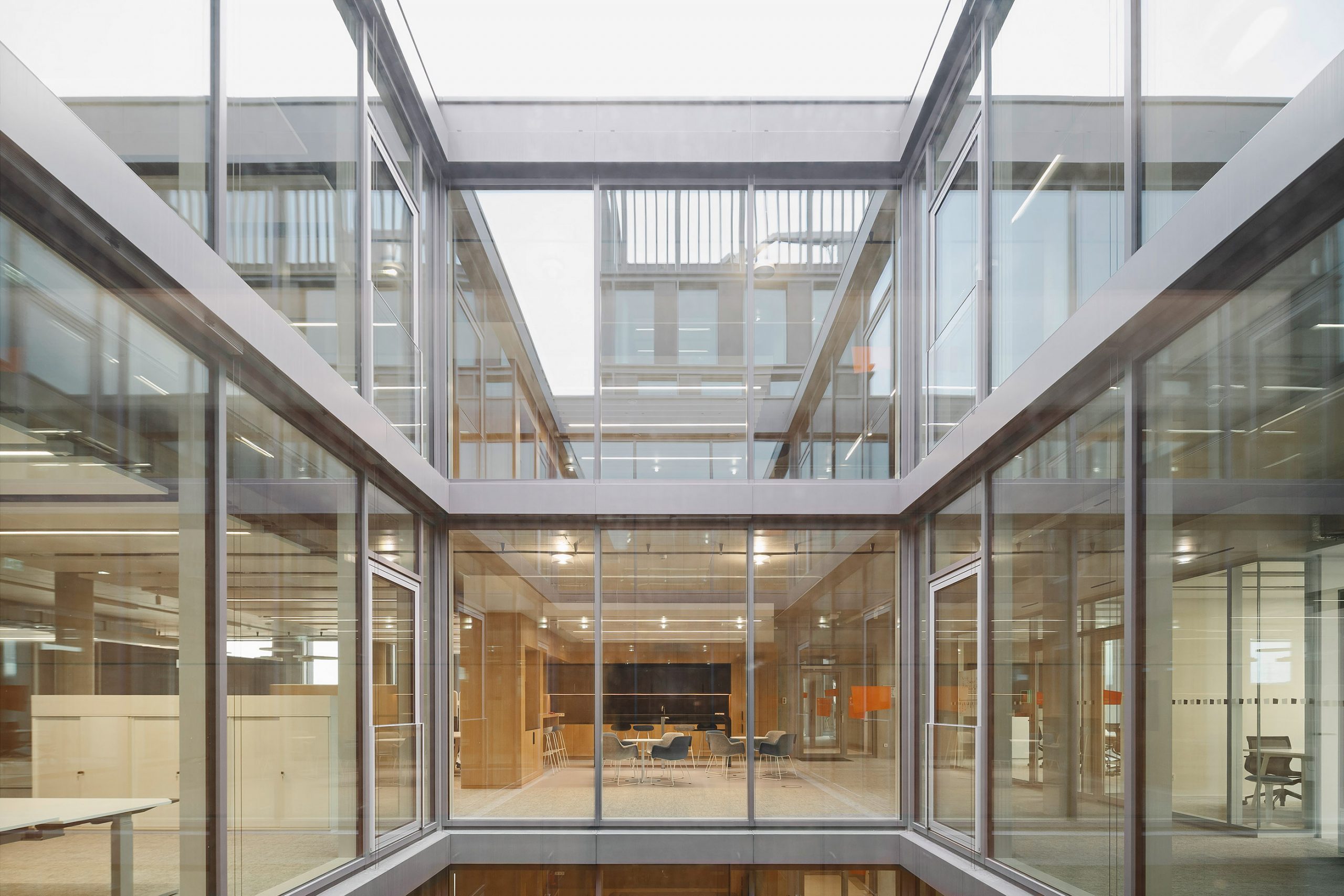 Der Neubau versteht sich als moderne Arbeitswelt mit menschlichem Maß. Großzügige Bürostrukturen, offene Grundrisskonzepte und natürlich belichtete Innenhöfe erzeugen eine Atmosphäre, die auf Austausch, Konzentration und Wohlbefinden gleichermaßen zielt. Die Raumtiefen variieren zwischen 7,80 m und 21,00 m und lassen eine Vielzahl an Büroformen zu – von Einzelbüros bis zu Open-Space-Strukturen. Die Raumplanung wurde gemeinsam mit der Volksbank in mehreren Workshops abgestimmt und in einem präzise gegliederten Flächenkonzept verankert. Nicht nur innen, auch außen steht Offenheit im Fokus: Die Architektur öffnet sich zur Stadt. Drei skulptural gestaffelte Baukörper – vom viergeschossigen Volumen bis zum achtgeschossigen Hochpunkt mit Technikgeschoss – strukturieren das Ensemble. Ein zentraler Eingangsplatz im Nordosten bildet die kommunikative Mitte, von der aus Volksbank, Konferenzbereiche und Cafeteria erschlossen werden. Im Westen öffnet sich das Gebäude zur Stadt mit einem markanten Hochpunkt und einem separaten Eingang für Polizei und Fremdnutzung.