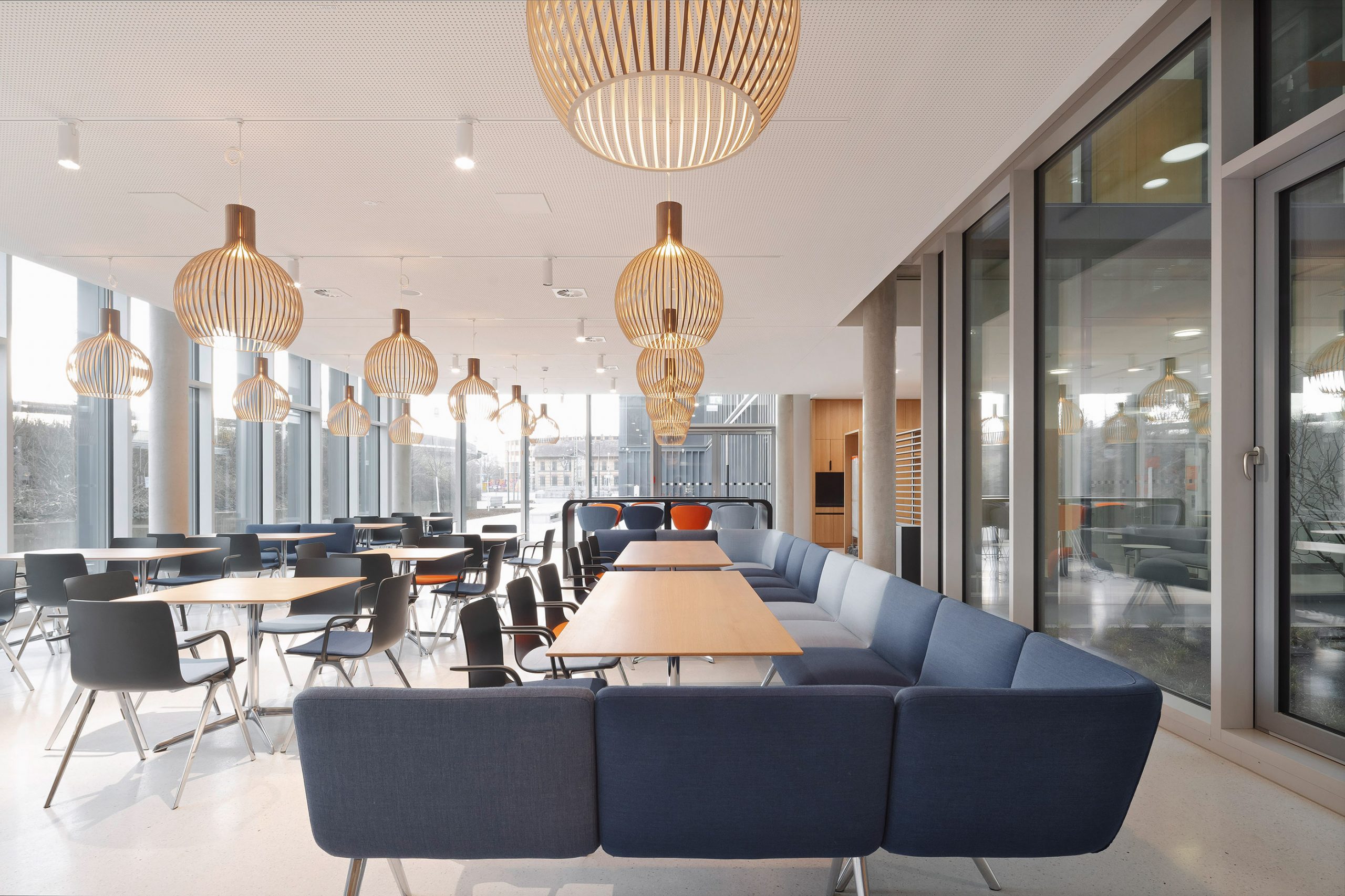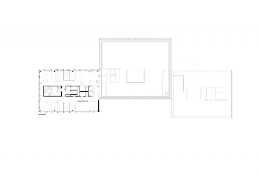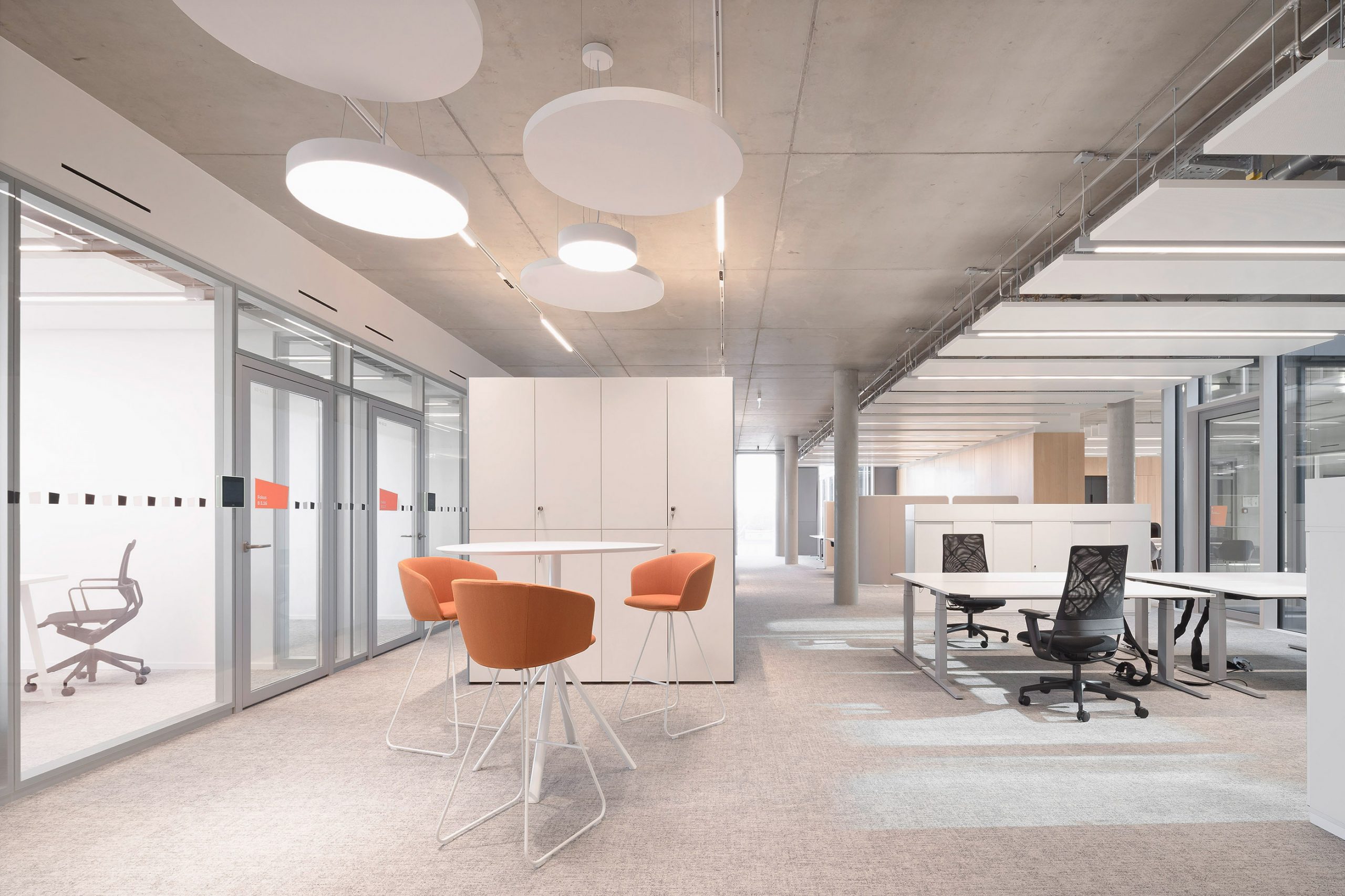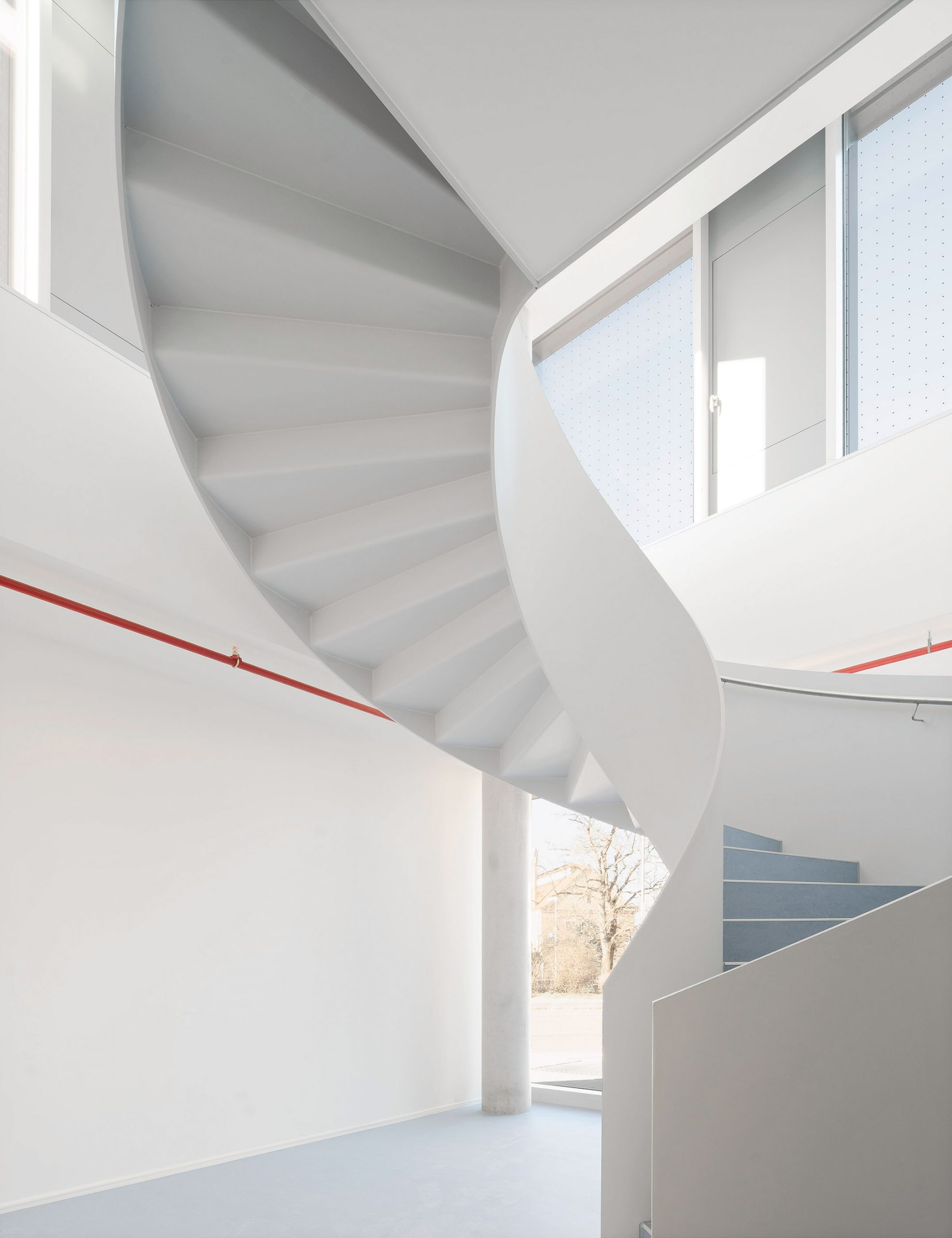 Der Neubau versteht sich als moderne Arbeitswelt mit menschlichem Maß. Großzügige Bürostrukturen, offene Grundrisskonzepte und natürlich belichtete Innenhöfe erzeugen eine Atmosphäre, die auf Austausch, Konzentration und Wohlbefinden gleichermaßen zielt. Die Raumtiefen variieren zwischen 7,80 m und 21,00 m und lassen eine Vielzahl an Büroformen zu – von Einzelbüros bis zu Open-Space-Strukturen. Die Raumplanung wurde gemeinsam mit der Volksbank in mehreren Workshops abgestimmt und in einem präzise gegliederten Flächenkonzept verankert. Nicht nur innen, auch außen steht Offenheit im Fokus: Die Architektur öffnet sich zur Stadt. Drei skulptural gestaffelte Baukörper – vom viergeschossigen Volumen bis zum achtgeschossigen Hochpunkt mit Technikgeschoss – strukturieren das Ensemble. Ein zentraler Eingangsplatz im Nordosten bildet die kommunikative Mitte, von der aus Volksbank, Konferenzbereiche und Cafeteria erschlossen werden. Im Westen öffnet sich das Gebäude zur Stadt mit einem markanten Hochpunkt und einem separaten Eingang für Polizei und Fremdnutzung.