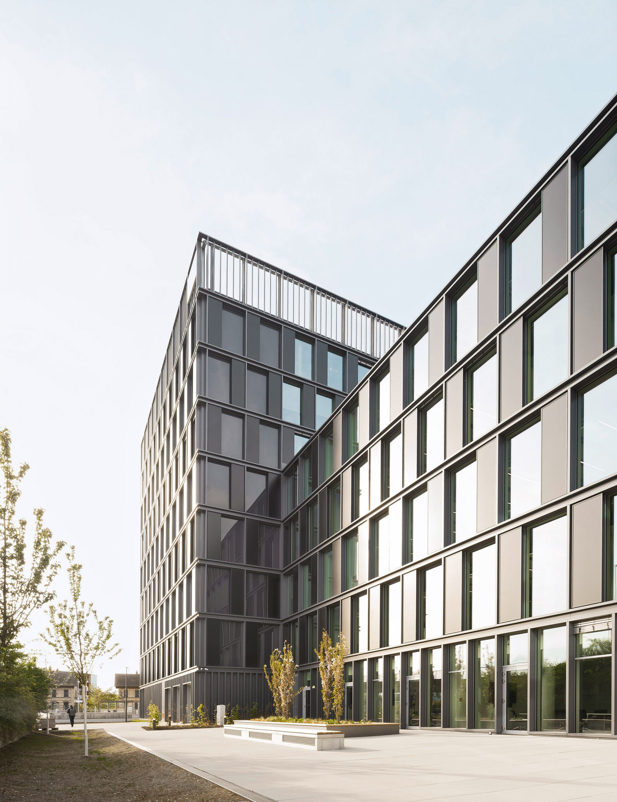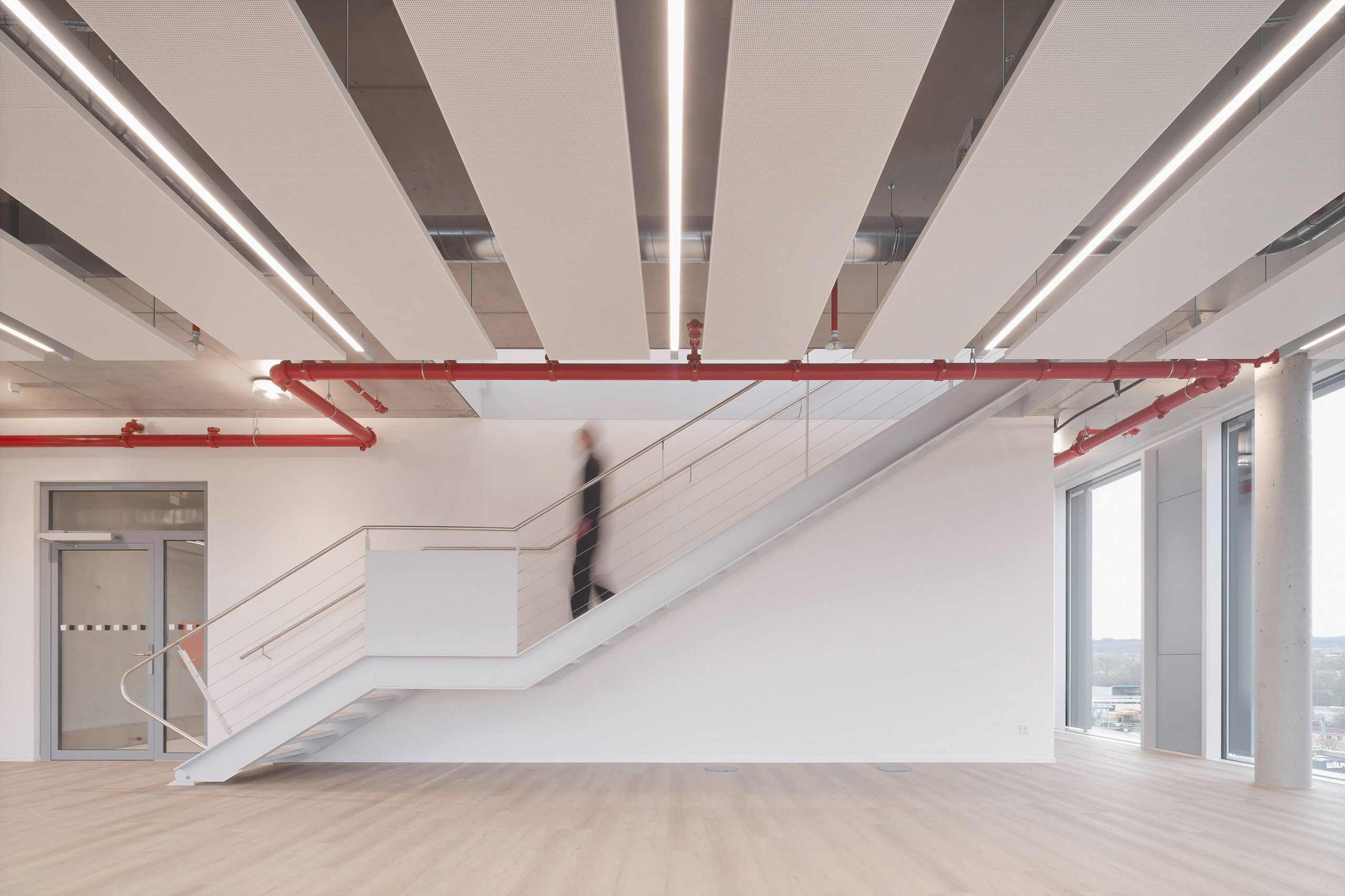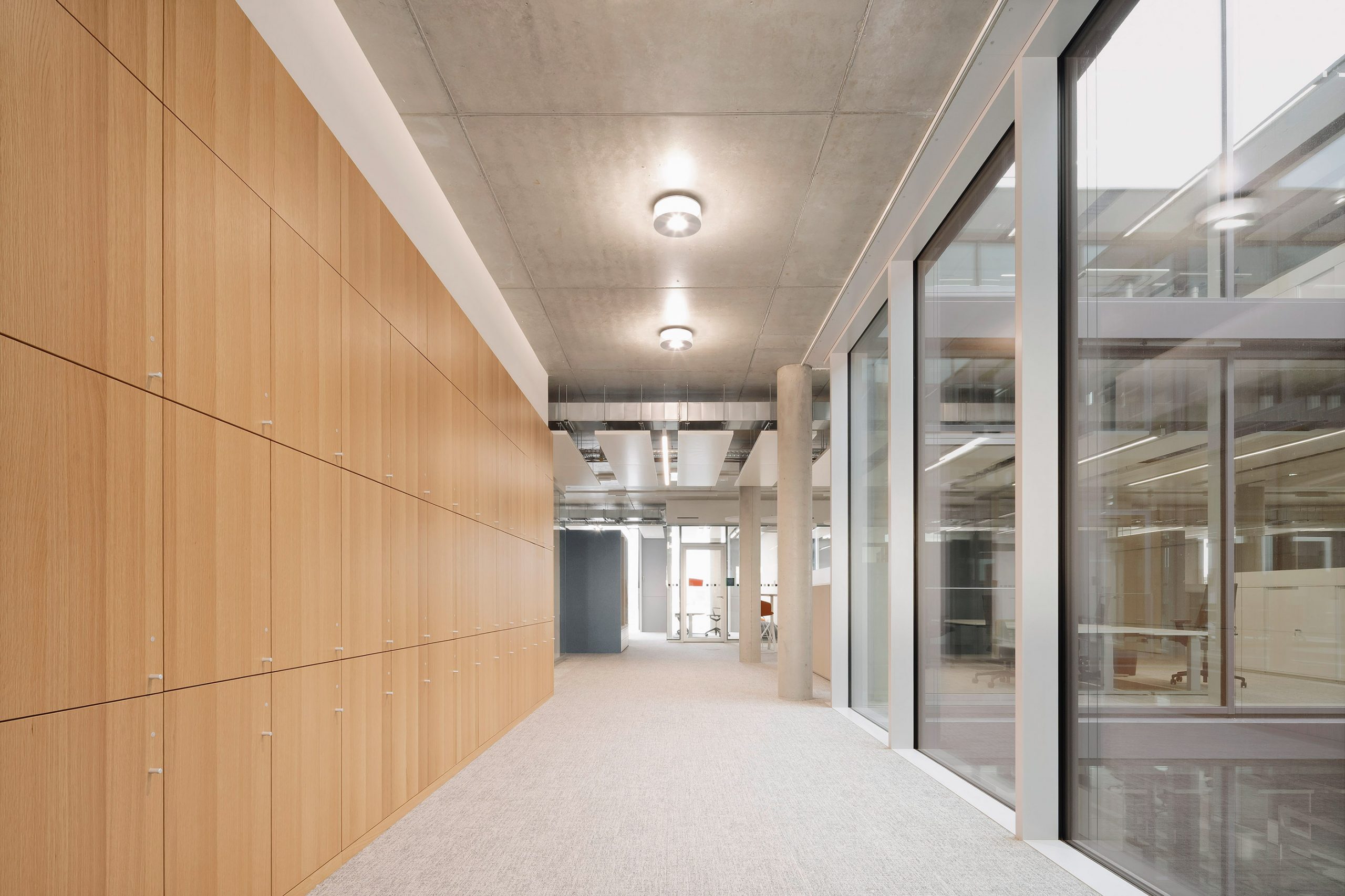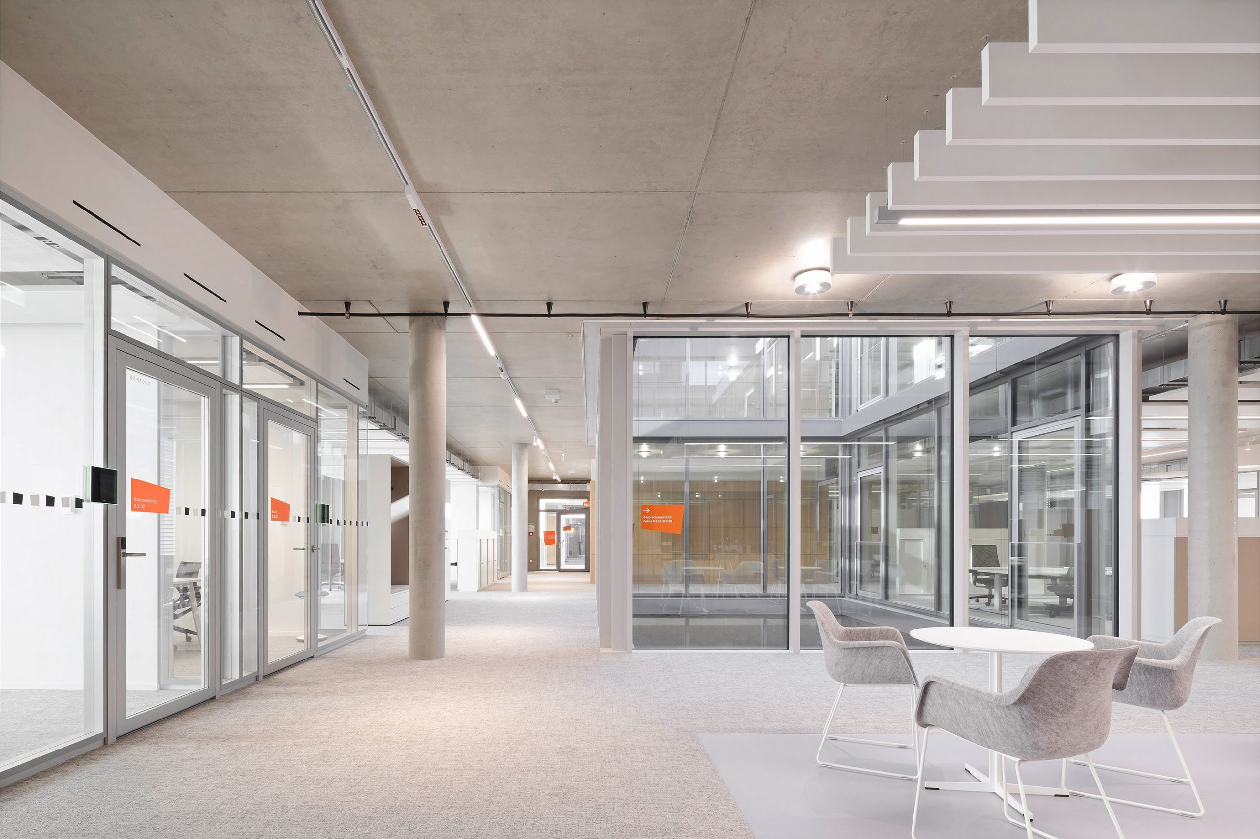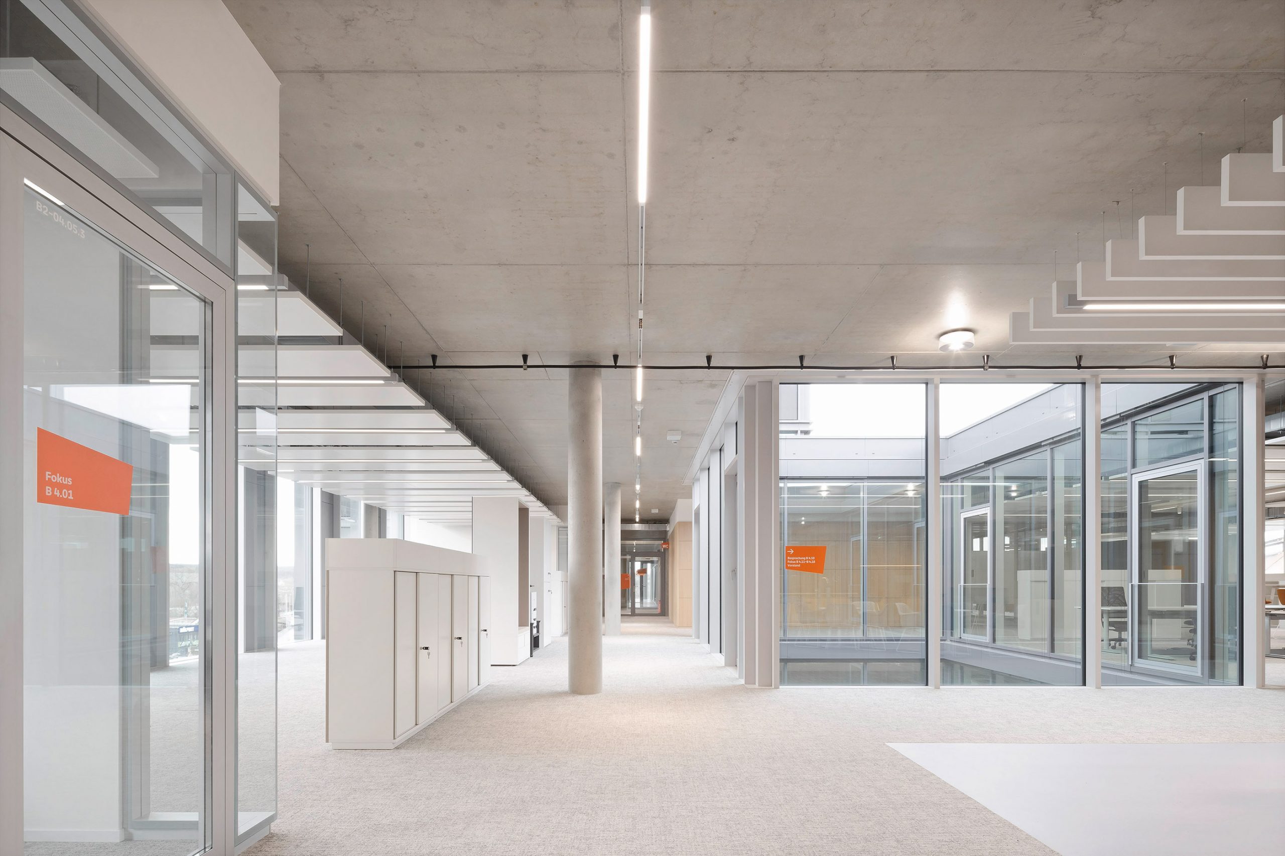 Die äußere Erscheinung des Gebäudes ist geprägt durch eine horizontal und vertikal gegliederte metallische Fassadenstruktur. Diese wird durch einen Wechsel von transparenten, festverglasten Fensterflächen und opaken Lüftungsflügeln mit vorgelagerten BIPV-Modulen rhythmisiert. Die Verwendung von Recyclingbeton als Primärmaterial sorgt für strukturelle Klarheit und ermöglicht mit Verbundstützen und Flachdecken ein hohes Maß an Flexibilität im Innenausbau. Ein zentrales Rastermaß von 1,35 m bzw. 2,70 m bildet die Grundlage der baulichen Organisation. Vier Haupttreppenhäuser – ergänzt durch Aufzüge – erschließen das Gebäude vertikal. Besonders hervorzuheben ist das Sicherheitstreppenhaus im Hochhausbereich mit eigenem Feuerwehraufzug. Die horizontale Erschließung aller Nutzungseinheiten verläuft entlang der Zentralachse der sich versetzenden Gebäudevolumina und bindet alle Nutzflächen barrierefrei an.