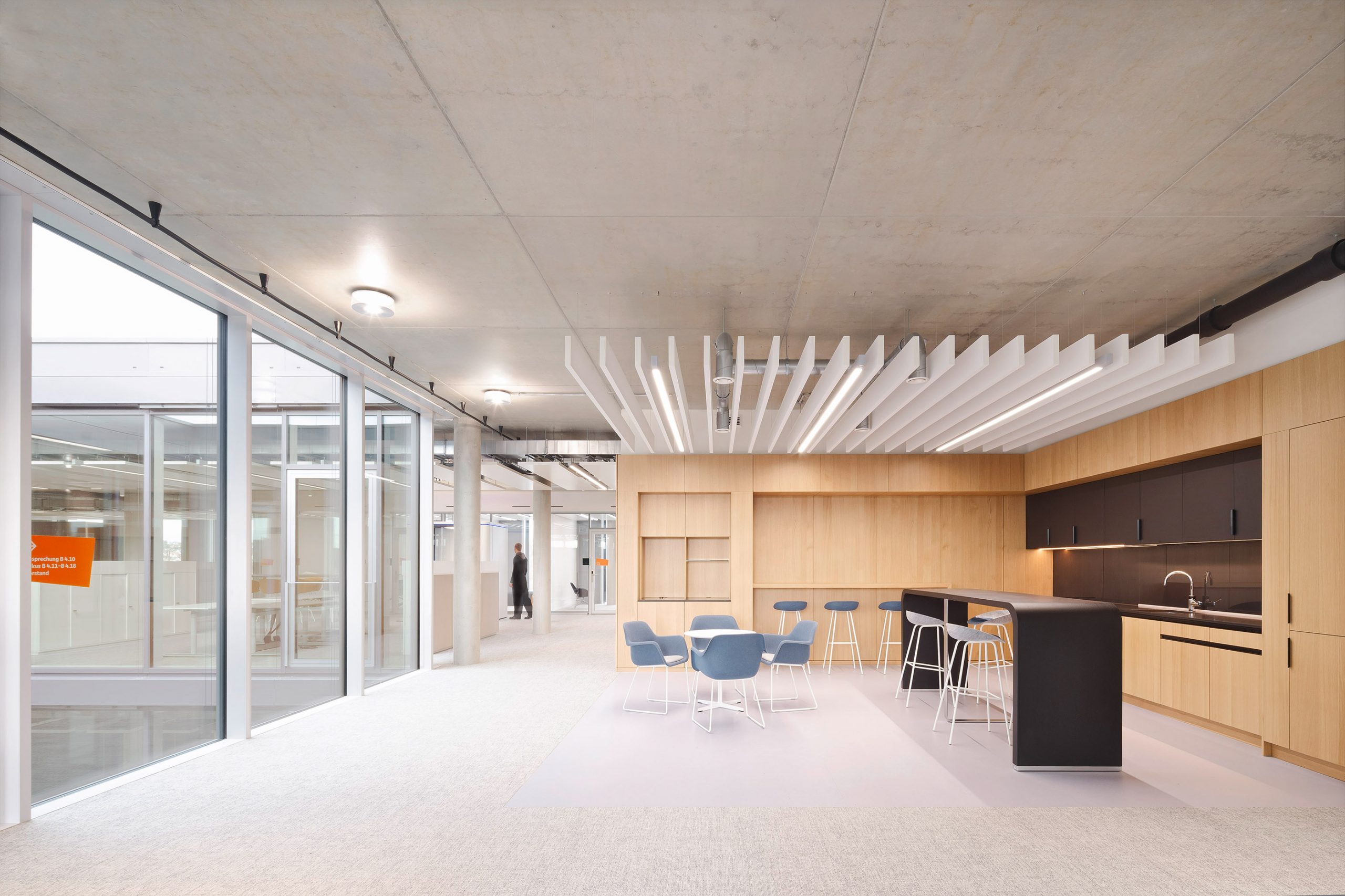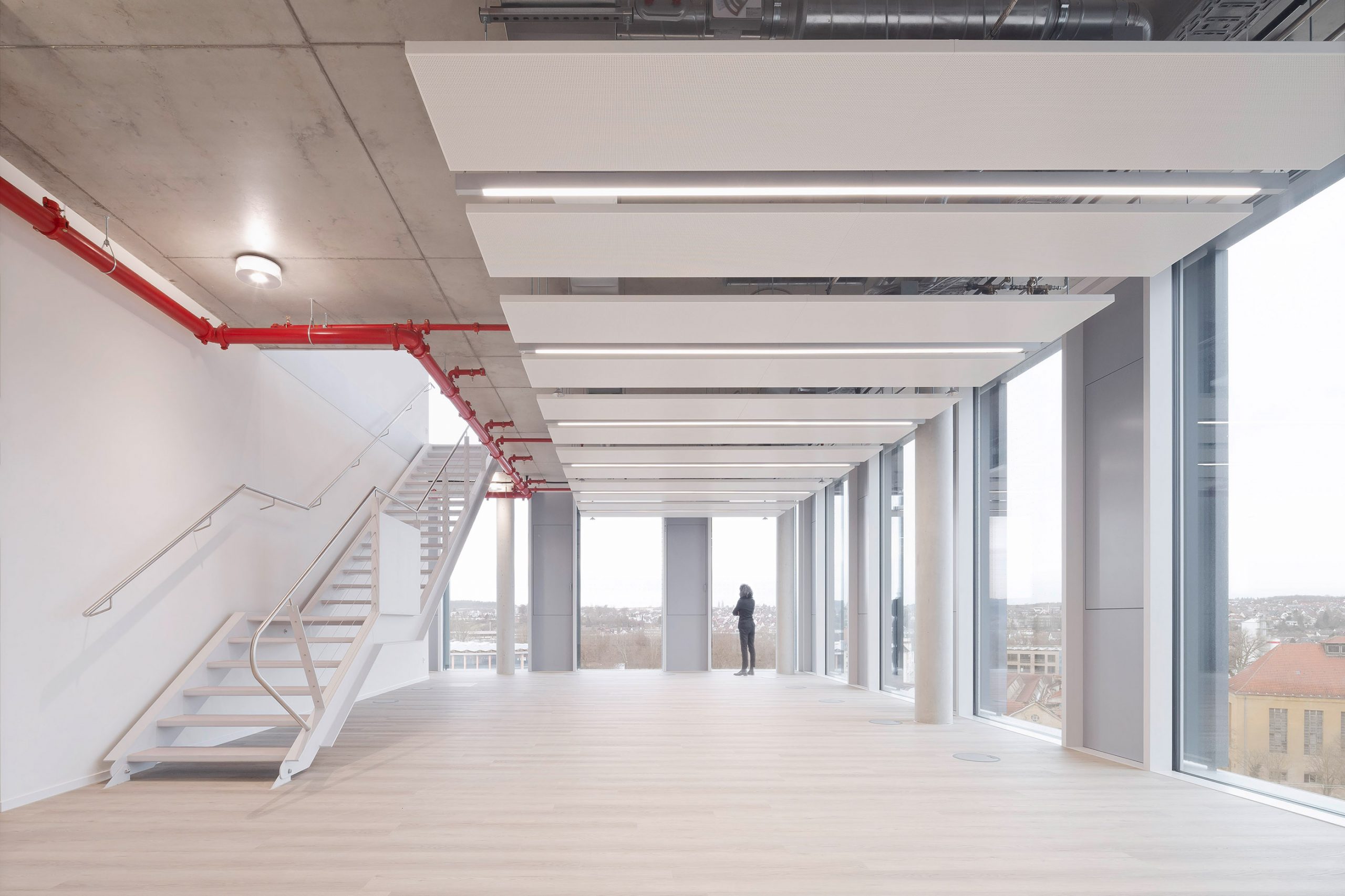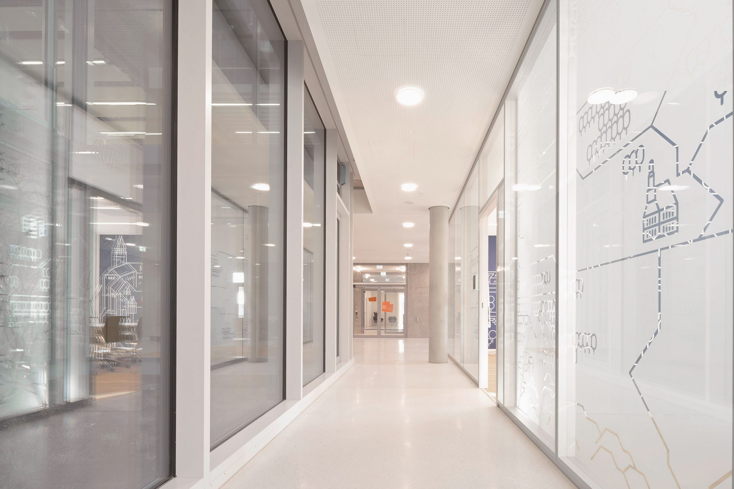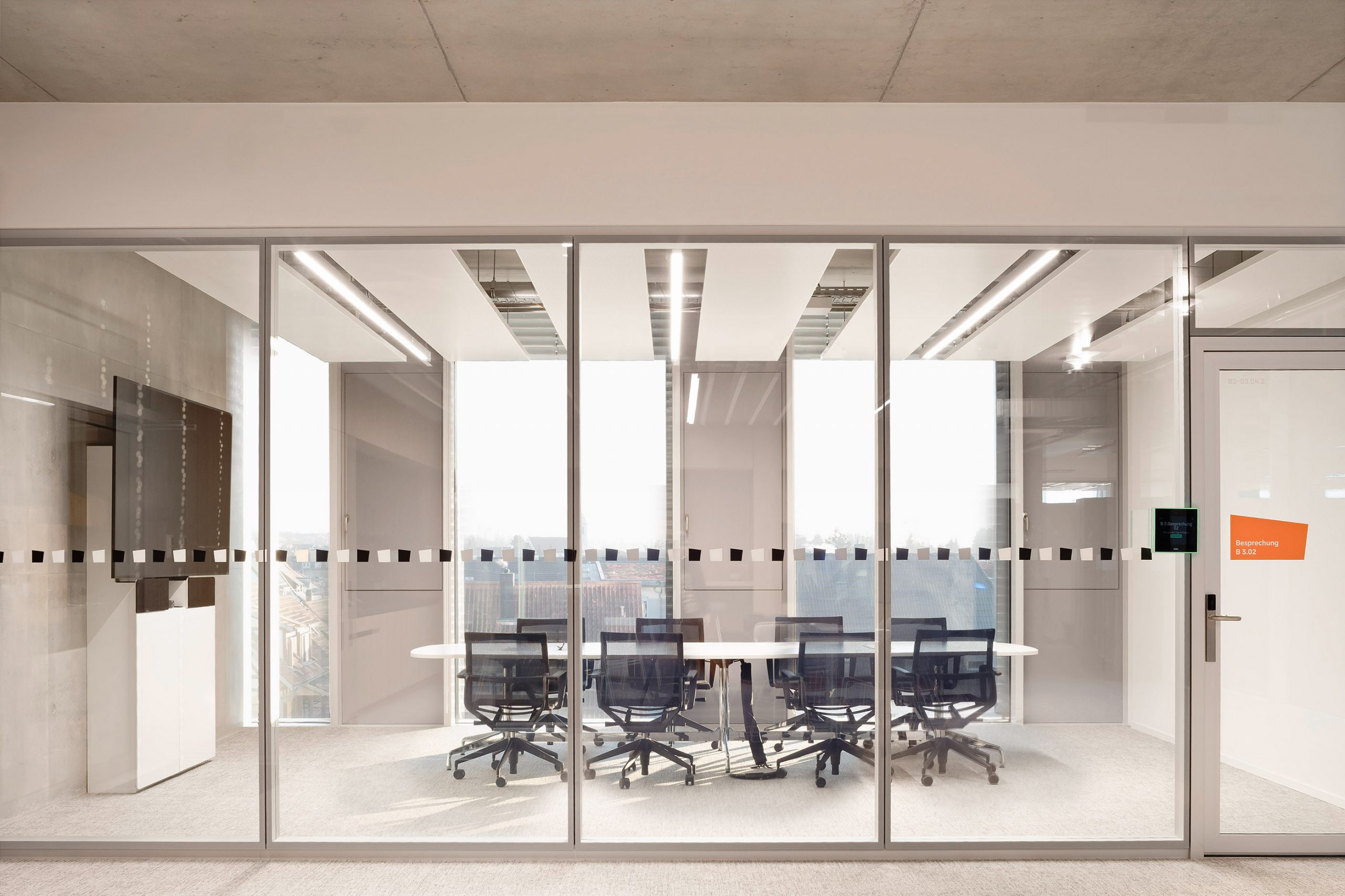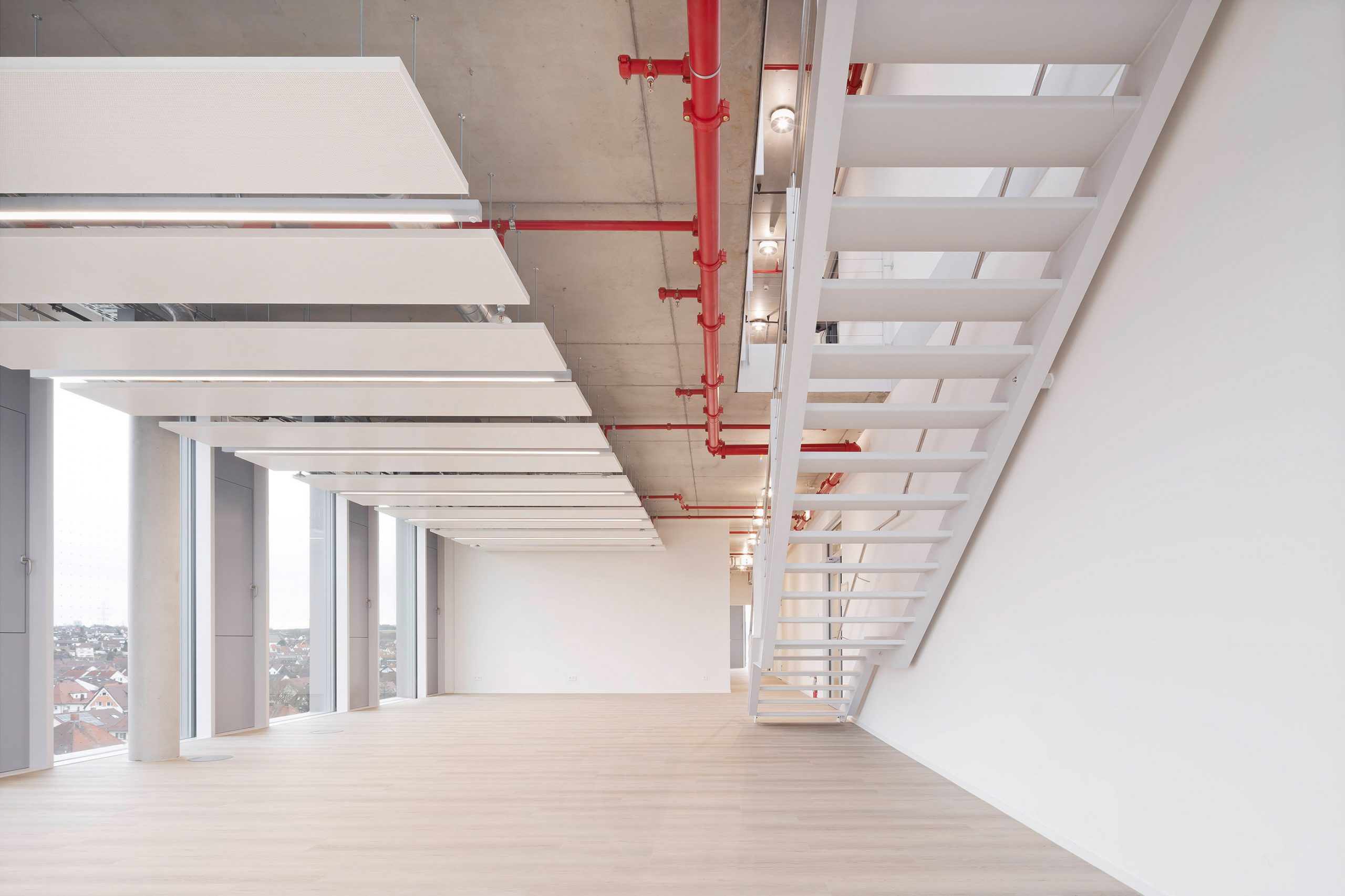Die äußere Erscheinung des Gebäudes ist geprägt durch eine horizontal und vertikal gegliederte metallische Fassadenstruktur. Diese wird durch einen Wechsel von transparenten, festverglasten Fensterflächen und opaken Lüftungsflügeln mit vorgelagerten BIPV-Modulen rhythmisiert. Die Verwendung von Recyclingbeton als Primärmaterial sorgt für strukturelle Klarheit und ermöglicht mit Verbundstützen und Flachdecken ein hohes Maß an Flexibilität im Innenausbau. Ein zentrales Rastermaß von 1,35 m bzw. 2,70 m bildet die Grundlage der baulichen Organisation. Vier Haupttreppenhäuser – ergänzt durch Aufzüge – erschließen das Gebäude vertikal. Besonders hervorzuheben ist das Sicherheitstreppenhaus im Hochhausbereich mit eigenem Feuerwehraufzug. Die horizontale Erschließung aller Nutzungseinheiten verläuft entlang der Zentralachse der sich versetzenden Gebäudevolumina und bindet alle Nutzflächen barrierefrei an.