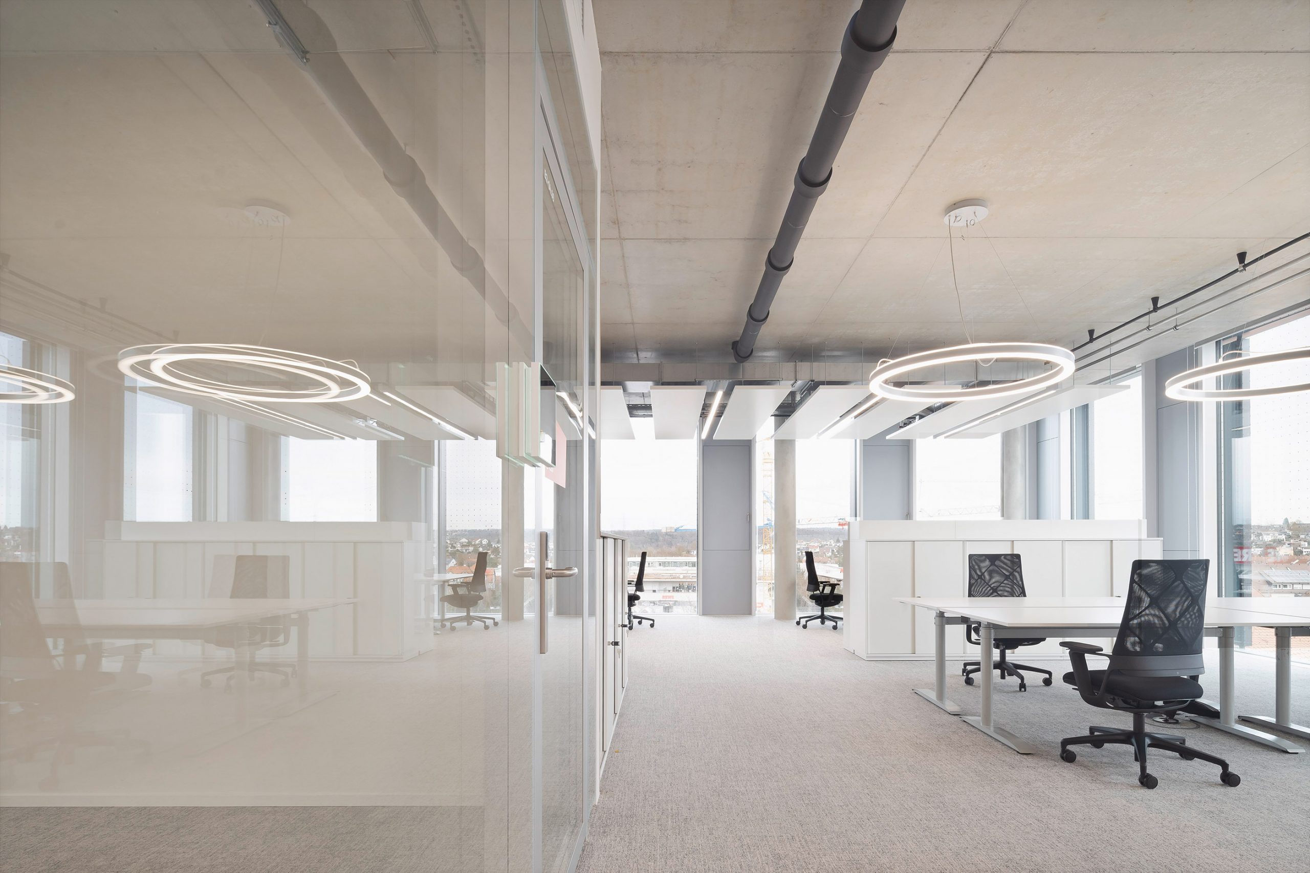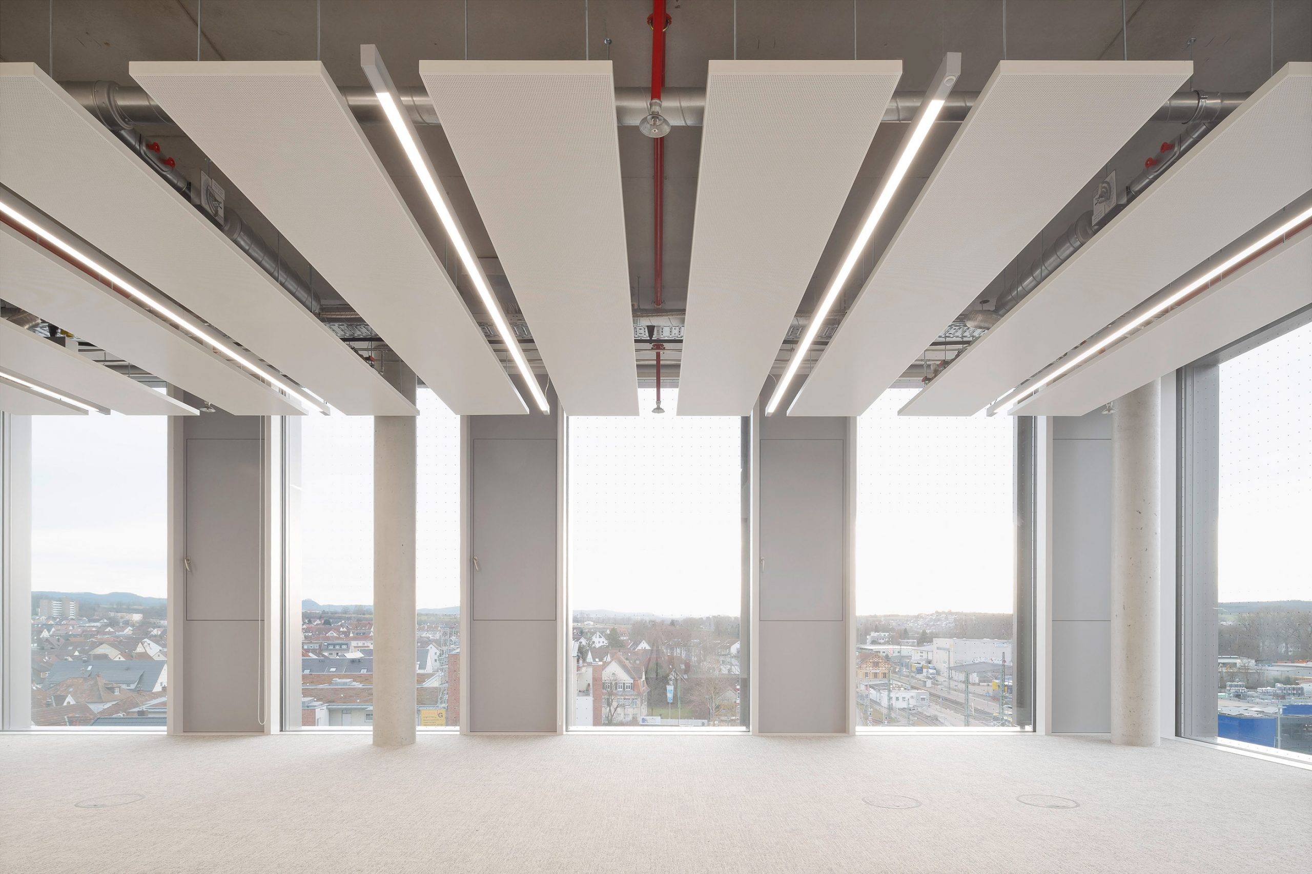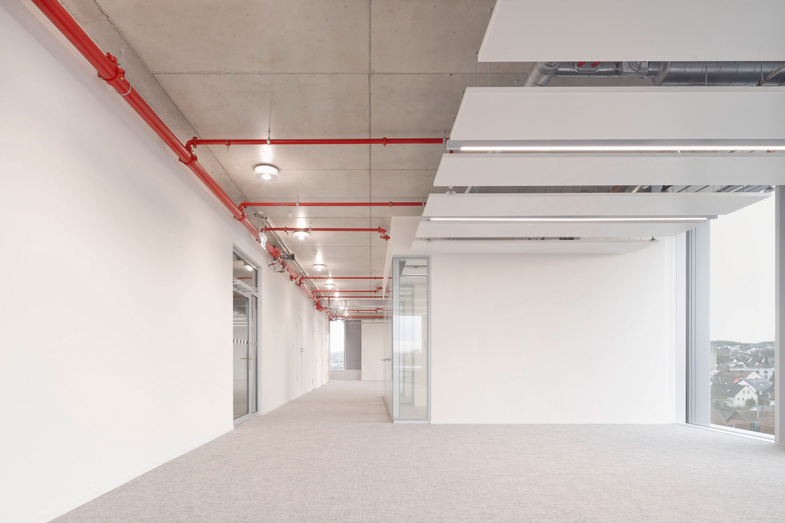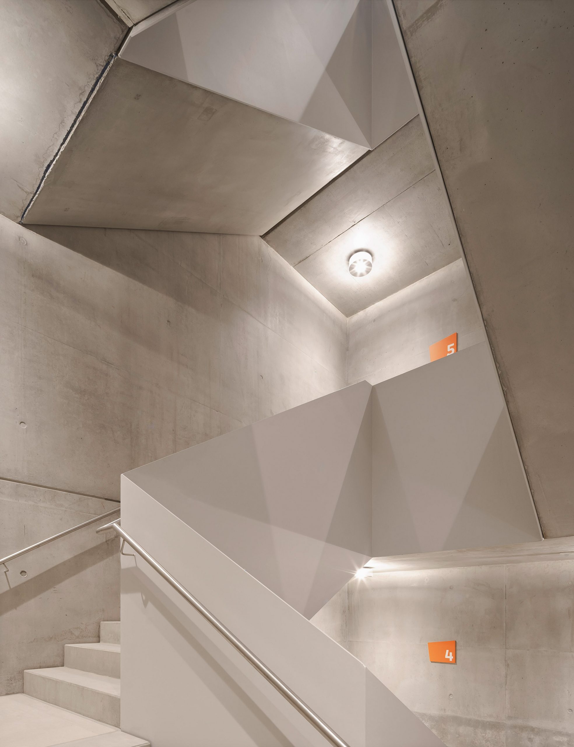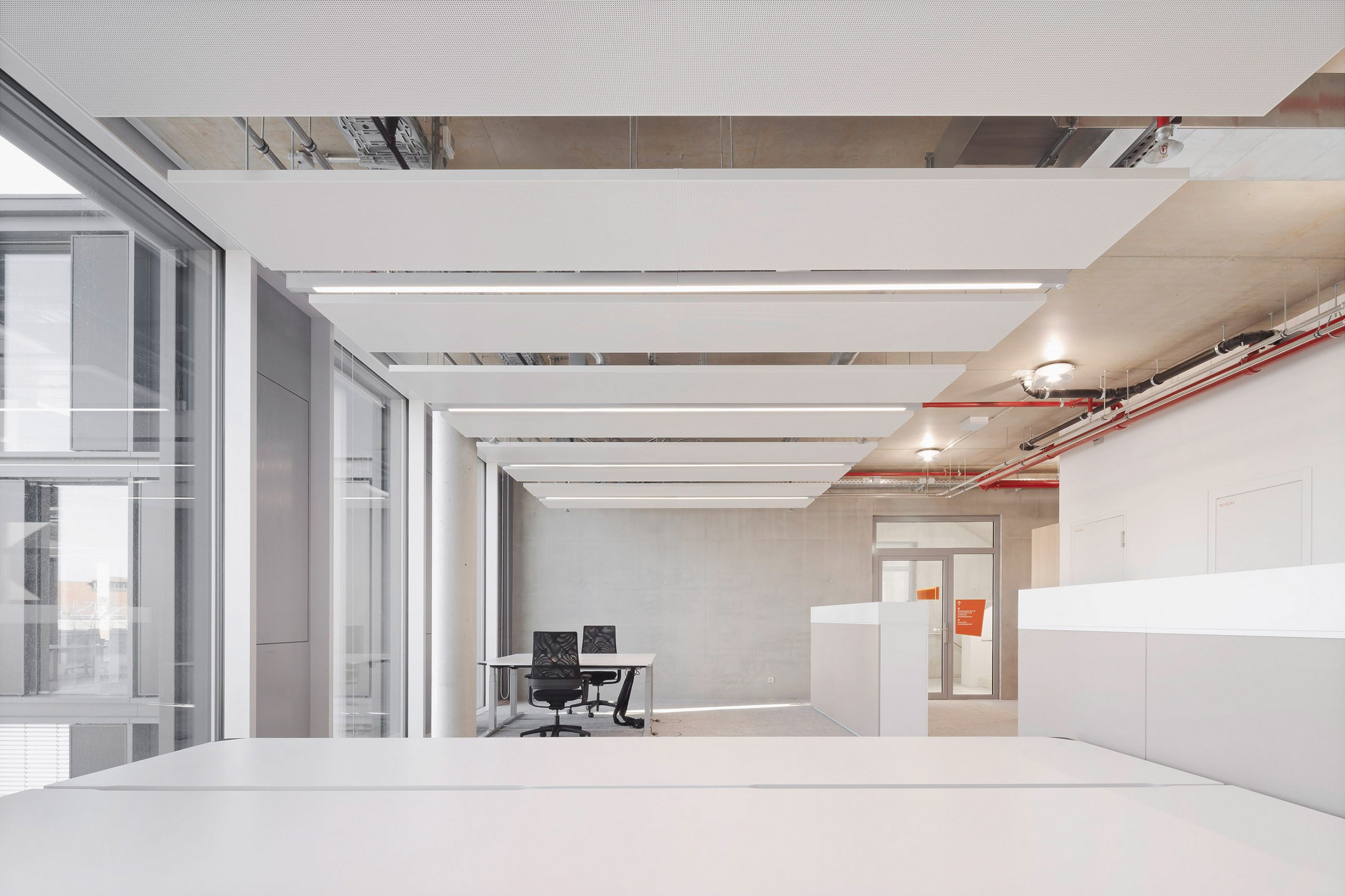 Die äußere Erscheinung des Gebäudes ist geprägt durch eine horizontal und vertikal gegliederte metallische Fassadenstruktur. Diese wird durch einen Wechsel von transparenten, festverglasten Fensterflächen und opaken Lüftungsflügeln mit vorgelagerten BIPV-Modulen rhythmisiert. Die Verwendung von Recyclingbeton als Primärmaterial sorgt für strukturelle Klarheit und ermöglicht mit Verbundstützen und Flachdecken ein hohes Maß an Flexibilität im Innenausbau. Ein zentrales Rastermaß von 1,35 m bzw. 2,70 m bildet die Grundlage der baulichen Organisation. Vier Haupttreppenhäuser – ergänzt durch Aufzüge – erschließen das Gebäude vertikal. Besonders hervorzuheben ist das Sicherheitstreppenhaus im Hochhausbereich mit eigenem Feuerwehraufzug. Die horizontale Erschließung aller Nutzungseinheiten verläuft entlang der Zentralachse der sich versetzenden Gebäudevolumina und bindet alle Nutzflächen barrierefrei an.