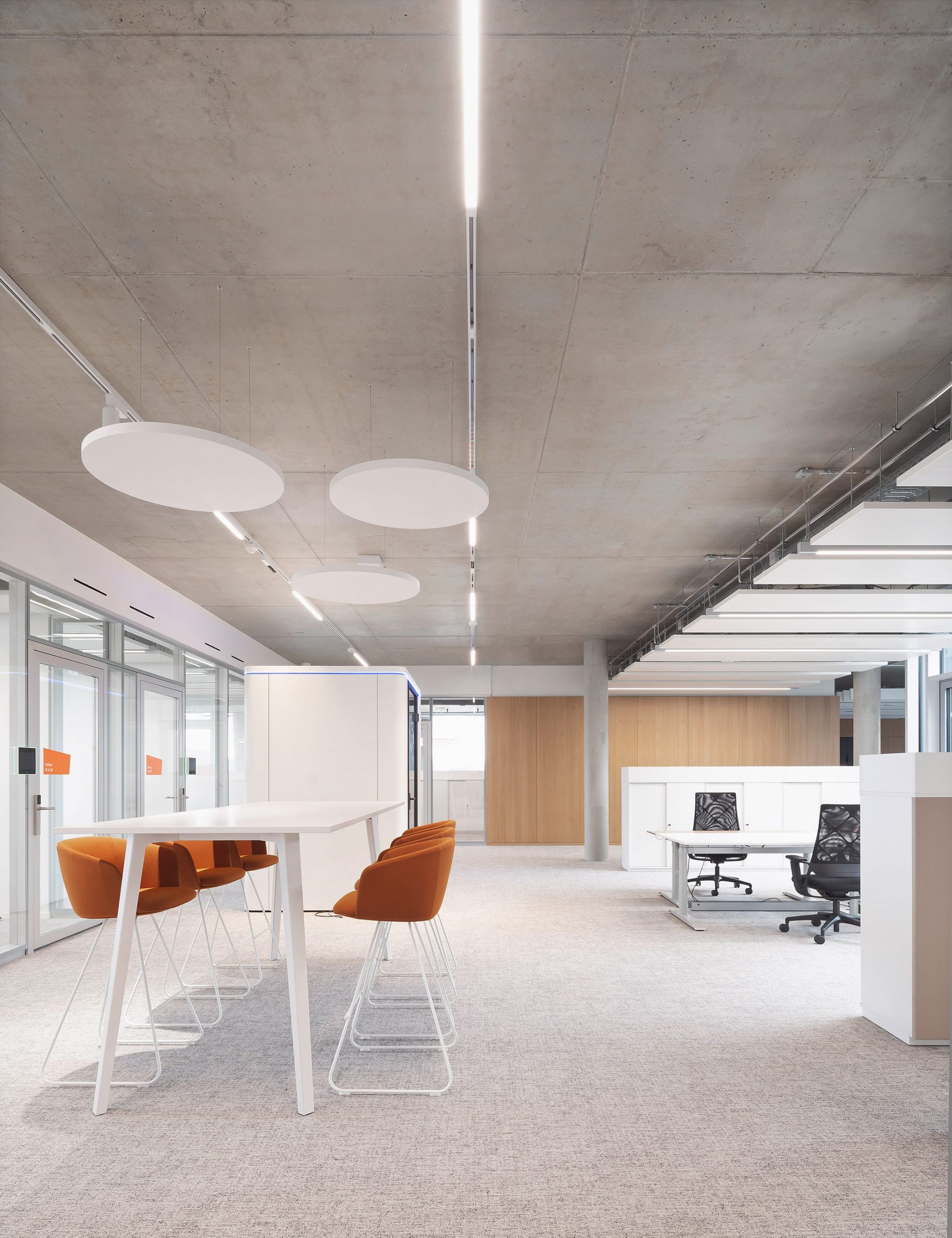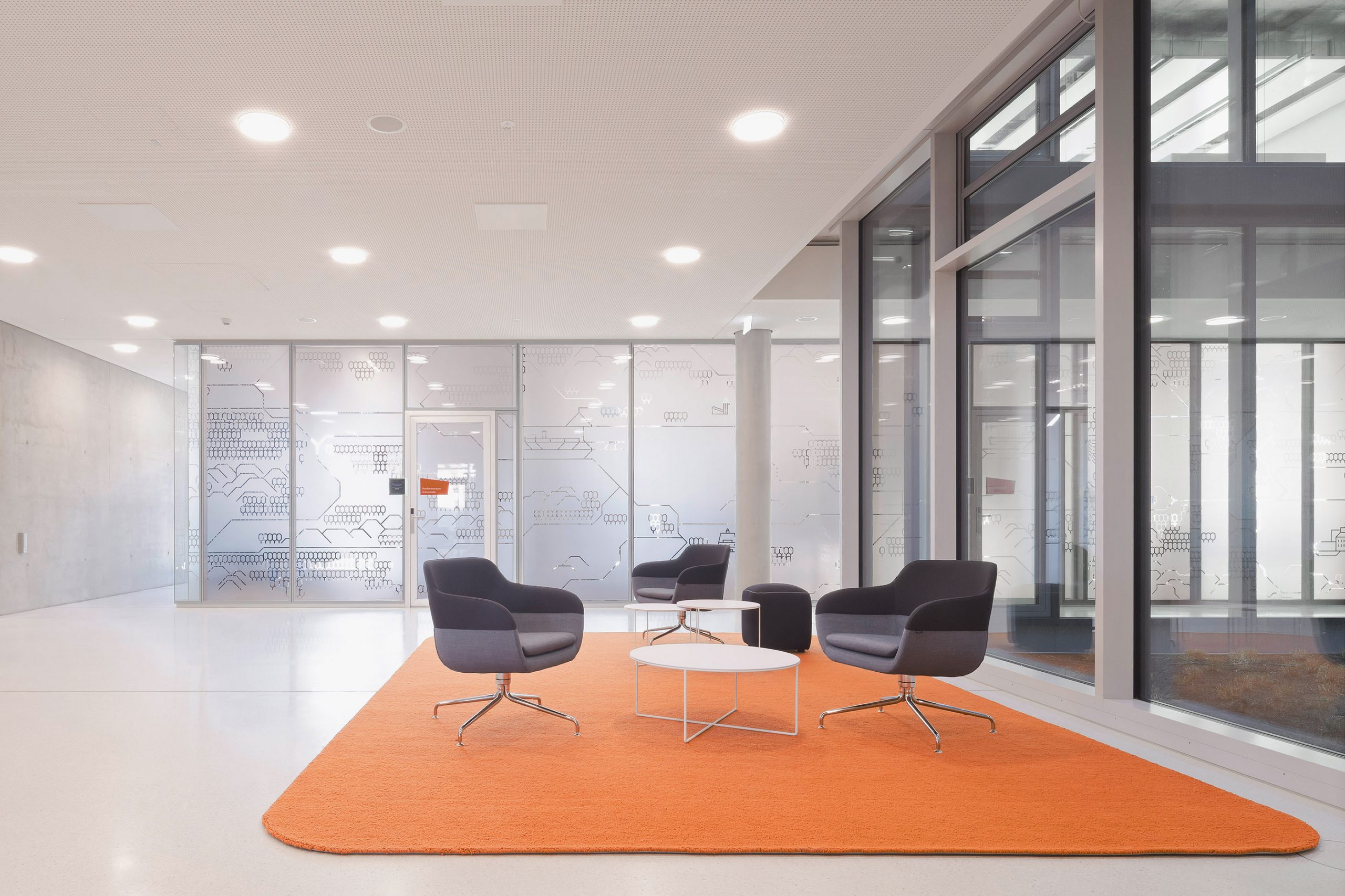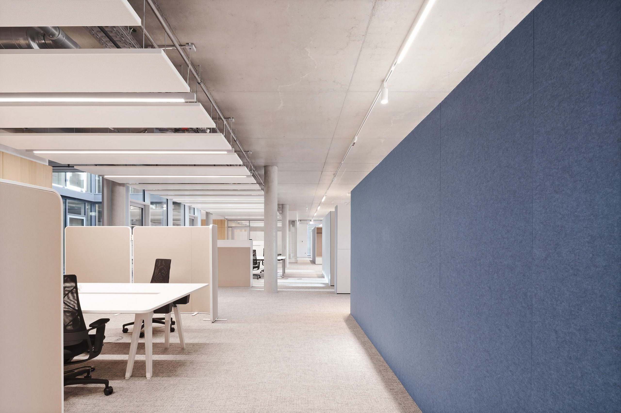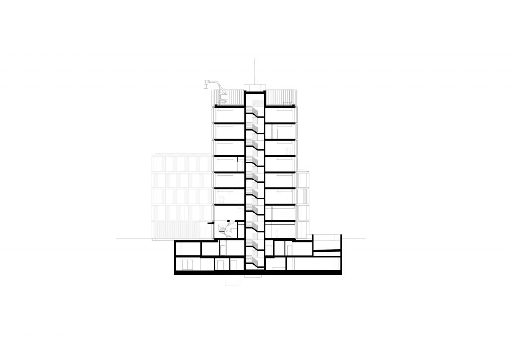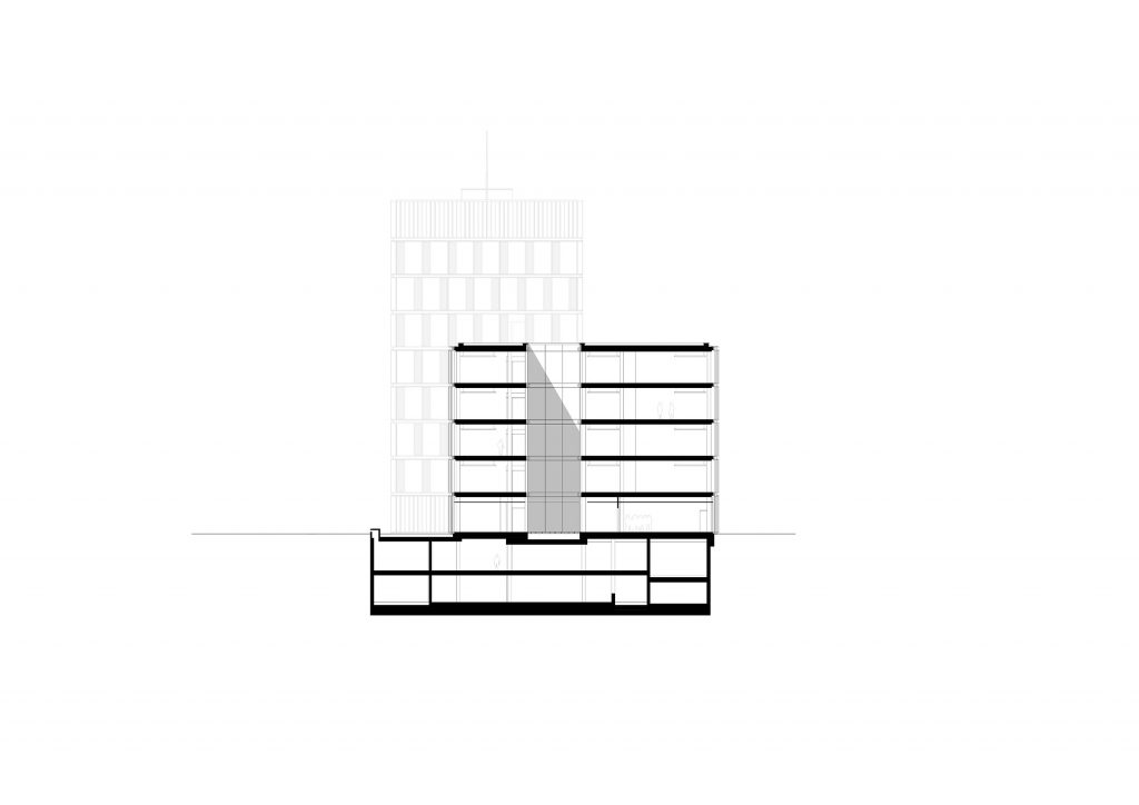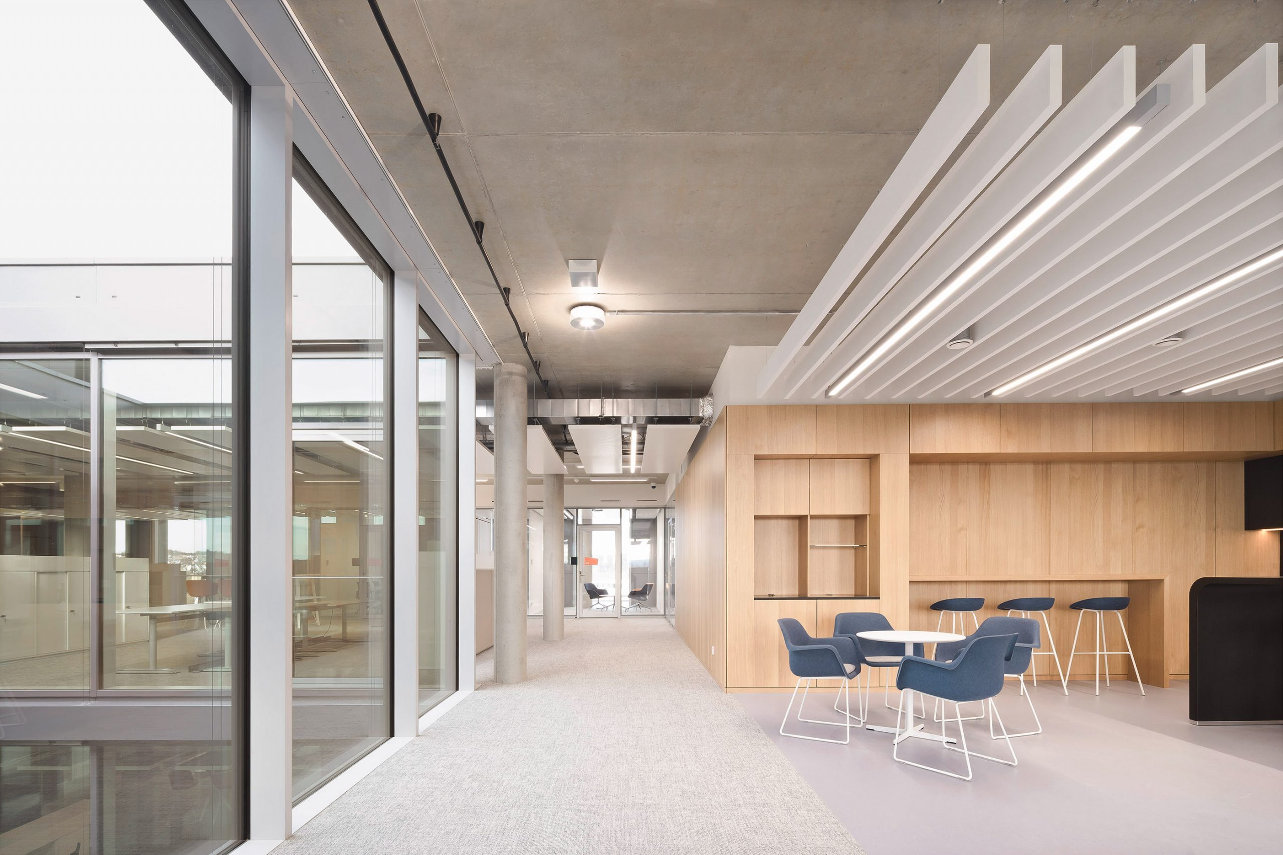Die äußere Erscheinung des Gebäudes ist geprägt durch eine horizontal und vertikal gegliederte metallische Fassadenstruktur. Diese wird durch einen Wechsel von transparenten, festverglasten Fensterflächen und opaken Lüftungsflügeln mit vorgelagerten BIPV-Modulen rhythmisiert. Die Verwendung von Recyclingbeton als Primärmaterial sorgt für strukturelle Klarheit und ermöglicht mit Verbundstützen und Flachdecken ein hohes Maß an Flexibilität im Innenausbau. Ein zentrales Rastermaß von 1,35 m bzw. 2,70 m bildet die Grundlage der baulichen Organisation. Vier Haupttreppenhäuser – ergänzt durch Aufzüge – erschließen das Gebäude vertikal. Besonders hervorzuheben ist das Sicherheitstreppenhaus im Hochhausbereich mit eigenem Feuerwehraufzug. Die horizontale Erschließung aller Nutzungseinheiten verläuft entlang der Zentralachse der sich versetzenden Gebäudevolumina und bindet alle Nutzflächen barrierefrei an.