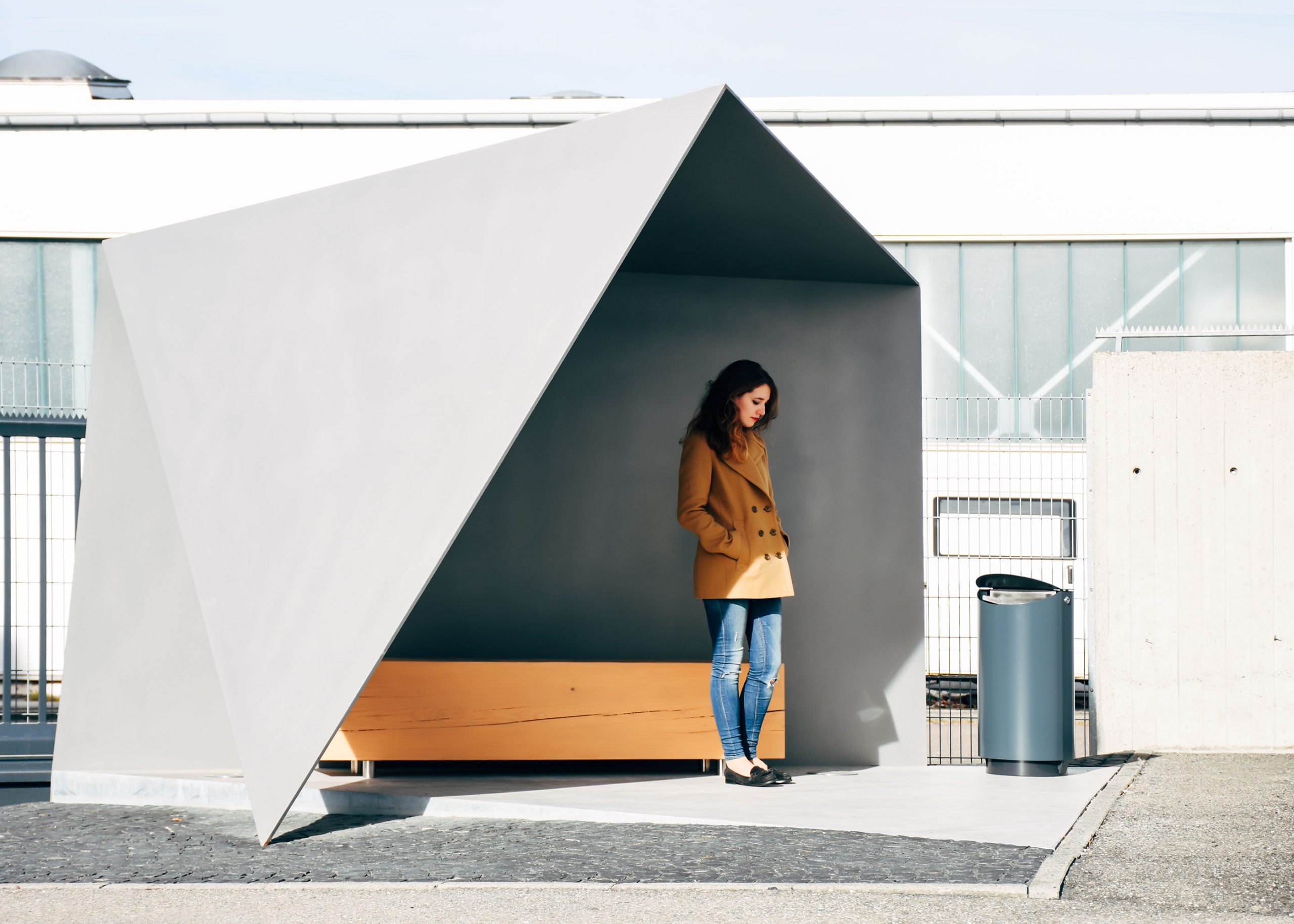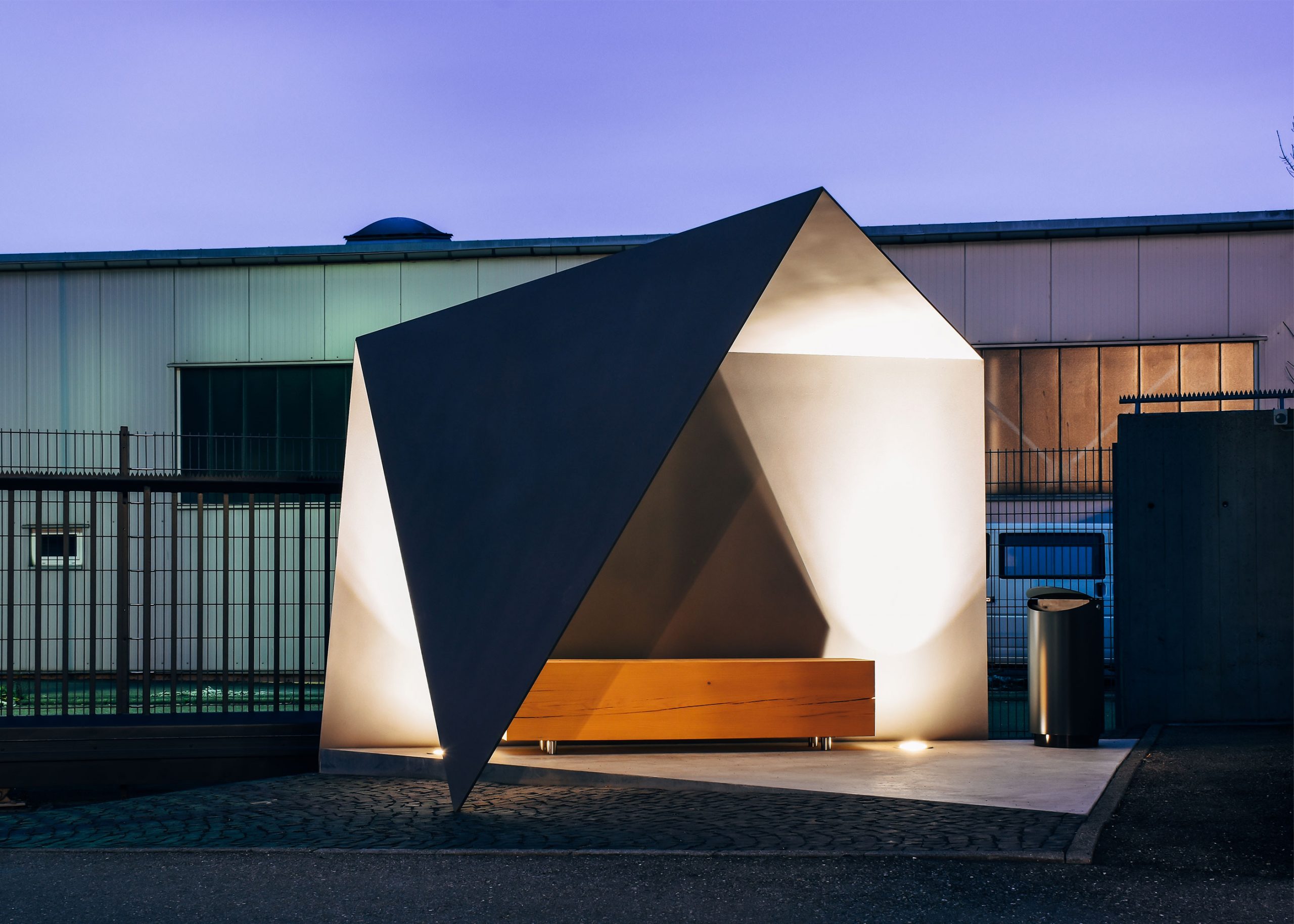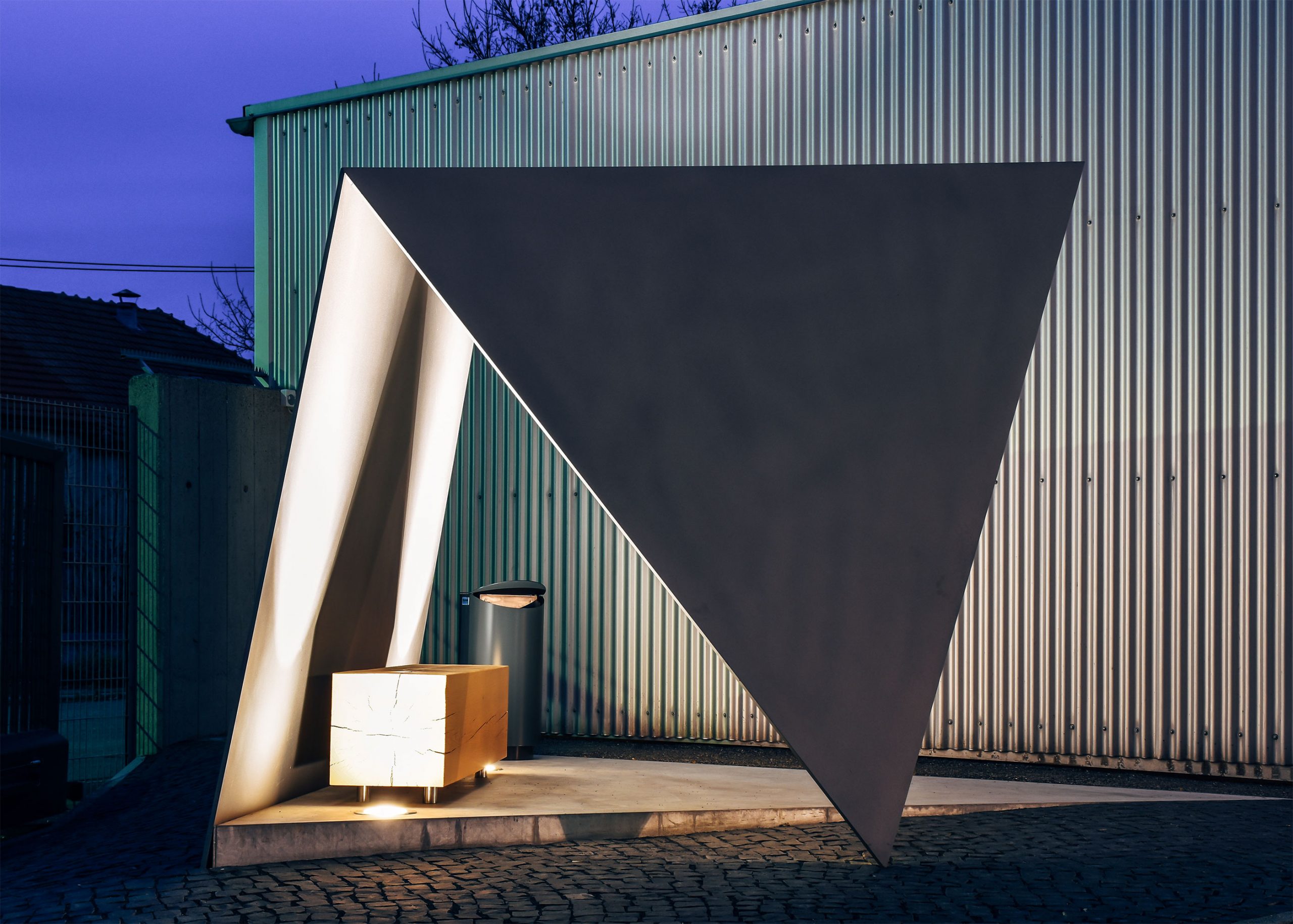 „Diese Architektur eckt genauso an wie Rauchen in der Öffentlichkeit. Deshalb wurde der Rückzugsort geschaffen. Ein Platz, der ausdrückt, wieviel Raum Rauchern heute noch verbleibt. Drei auf drei Meter, und das auf einem riesigen Firmengelände. Die rudimentäre Stätte symbolisiert das Raucher-Schicksal mannigfaltig. Auf einem Sünder-Bänkchen darf der Qualmer Platz nehmen, von hinten drückt ihm dabei ein Metalldach ins Kreuz und nötigt eine nach vorne gebeugte Haltung ab. Demut durch Gestaltung? Vielleicht ist das aber auch keine Architektur, sondern nur eine zugespitzte Form der Persiflage. Der Wink mit dem offenen Dach? Raucher u. Nichtraucher müssen fürein. Verständnis haben – Offenheit für den Anderen macht die Welt gleich viel besser. Die Semantik verbietet den angeregten Zugriff auf die „Skulptur“ – hierbei handelt es sich um bildende Kunst.“ (Pressestimme)