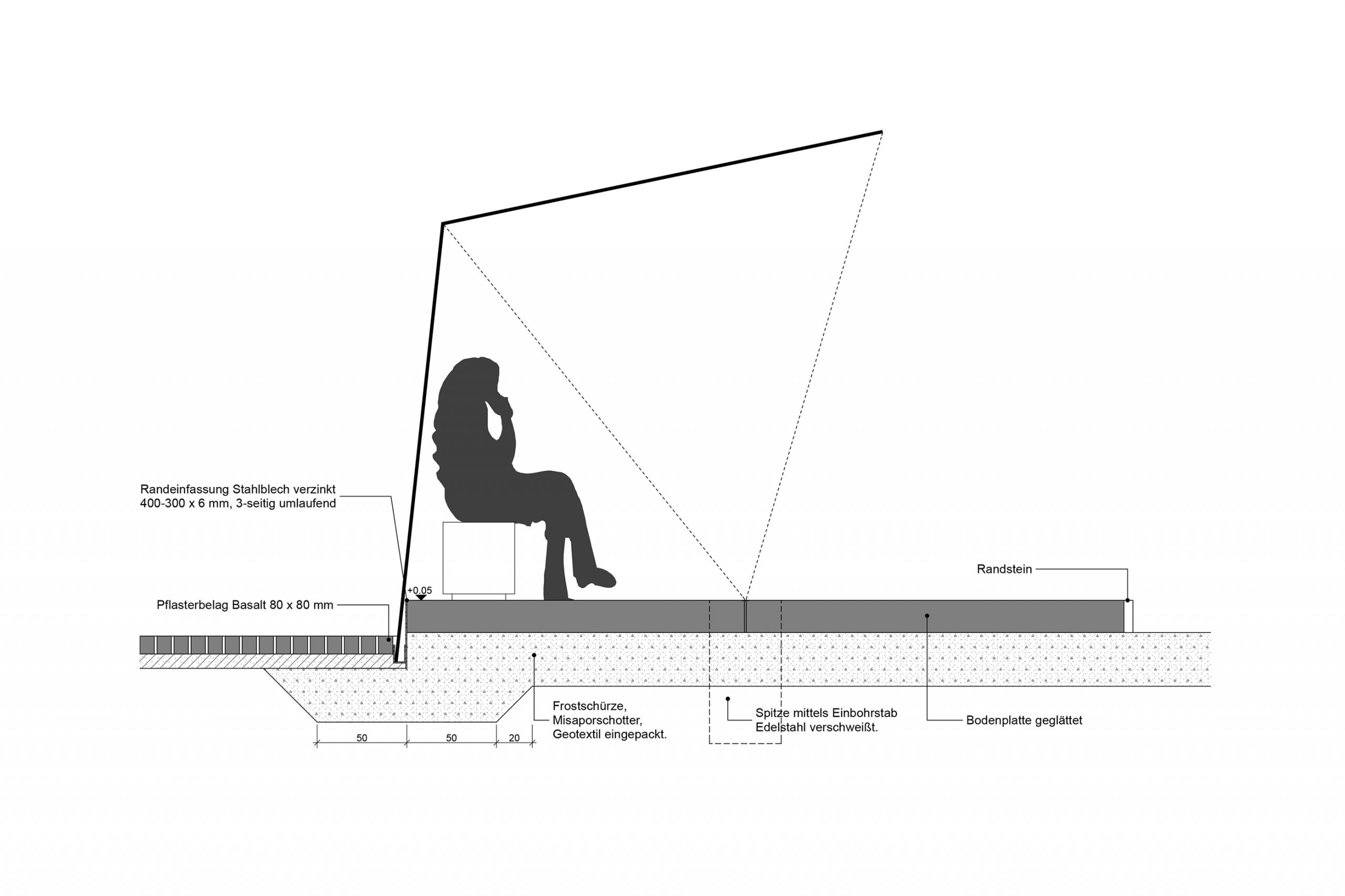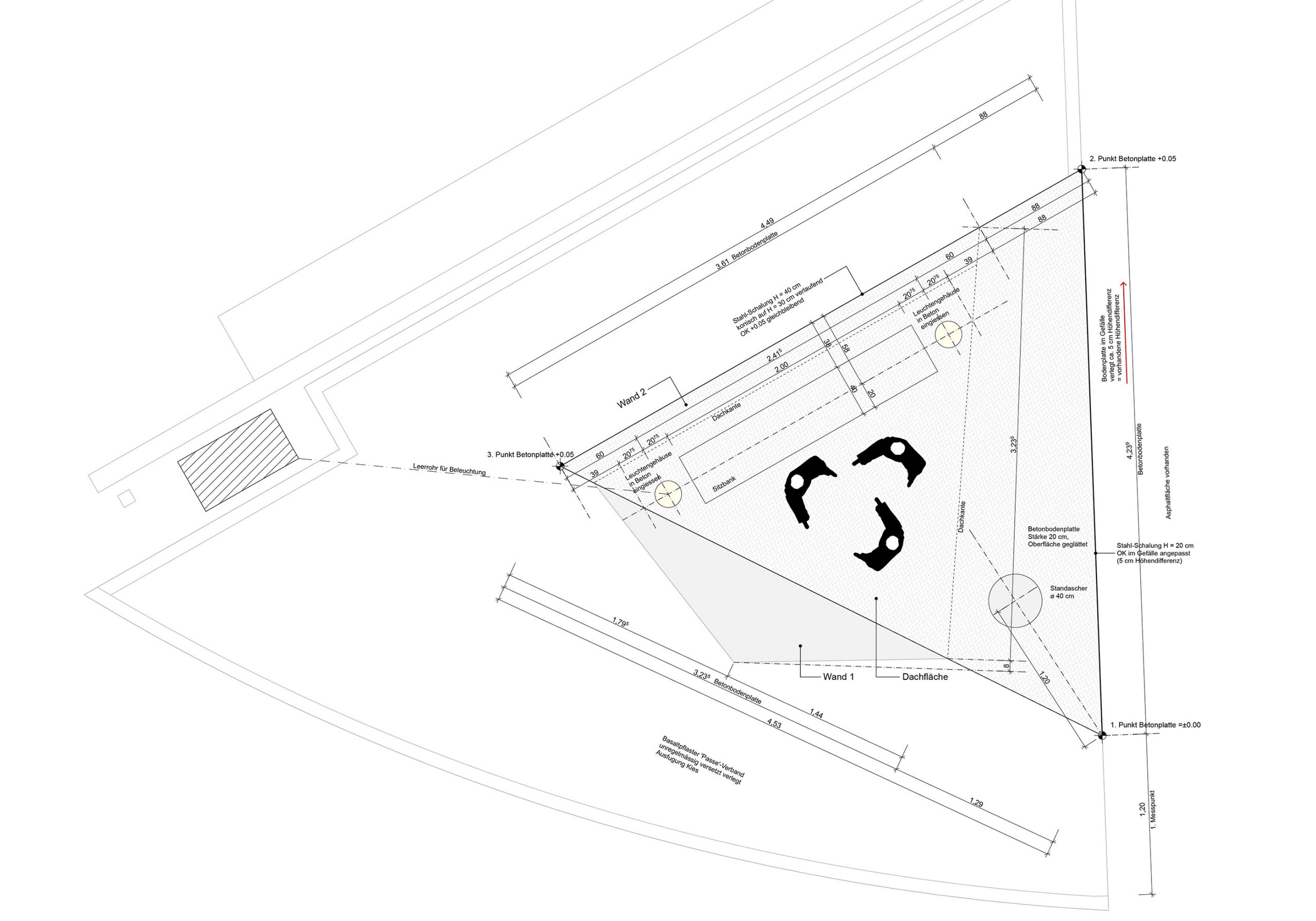 Die Erläuterung beschränkt sich auf die Frage des Umgangs mit der kleinen Entwurfsaufgabe im vorgegeben Kontext verschiedener Bewegungsräume am Rande industrieller Tagesabläufe. Uns interessiert und beschäftigt hierbei die Frage, ob hier die Funktion und / oder die Gestalt im Vordergrund steht und sich dem Betrachter stellt oder sogar offeriert. Wir denken, dass sich die Baulichkeit über die gegebene Grundstücksfläche definiert, die Materialität aus dem Gegebenen aufnimmt und durch den Inhalt der Planungsaufgabe ein Stück Modernität das Bild des Bauherrn widerspiegeln soll. Dies bedeutet für uns, die grundlegenden Strukturen des Bestehenden aufzu- spüren, die den Ort bestimmen. Wir sehen hier den Bezug des Einzelnen zum Ganzen und somit den Verbund Aller, die das Gefüge definieren. So soll eine Synergie mit dem Umfeld entstehen mit dem Anspruch der Entwicklung des Formbildes aus der Identität des Ortes. Wir denken, dass das Geplante sich der Diskussion entziehen muss, ob es durch Modernität einen Kontrast bildet, oder so tut, als wäre es ein halbes Jahrhundert alt. Neu, konzipiert aus der dreiecksförmigen Geometrie des Grundstücks, in guter handwerklicher Qualität, mit vertrauten, einfachen Materialien und schönen Fügungen im Zusammenspiel derer. Eine einfache Geometrie, den Kindheitstraum eines Jeden über die Form einer Zeltdachkonstruktion ansprechend, spiegelt sie menschliche Dimension im Anspruch an Kommunikationsfähigkeit und auch Ruhe an diesem Ort wider.